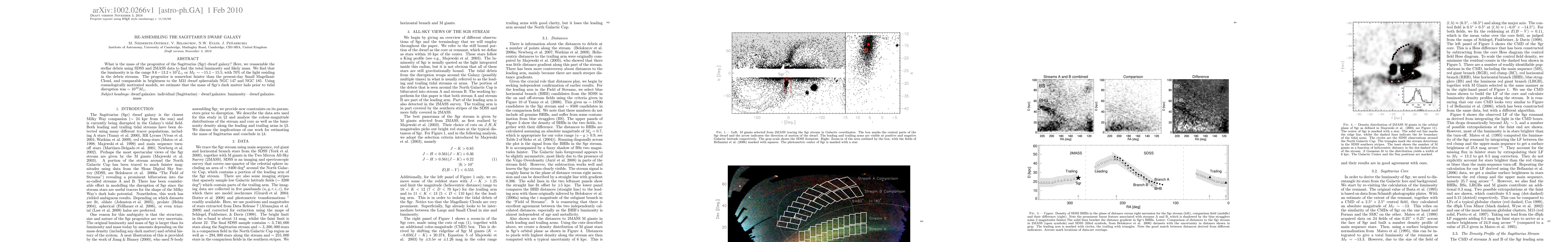 This paper reconstructs the Sagittarius dwarf galaxy's progenitor using SDSS and 2MASS data, estimating its luminosity and mass. The progenitor had a luminosity of 9.6-13.2 x10^7 solar luminosities, and its dark matter halo mass before disruption was approximately 10^10 solar masses.