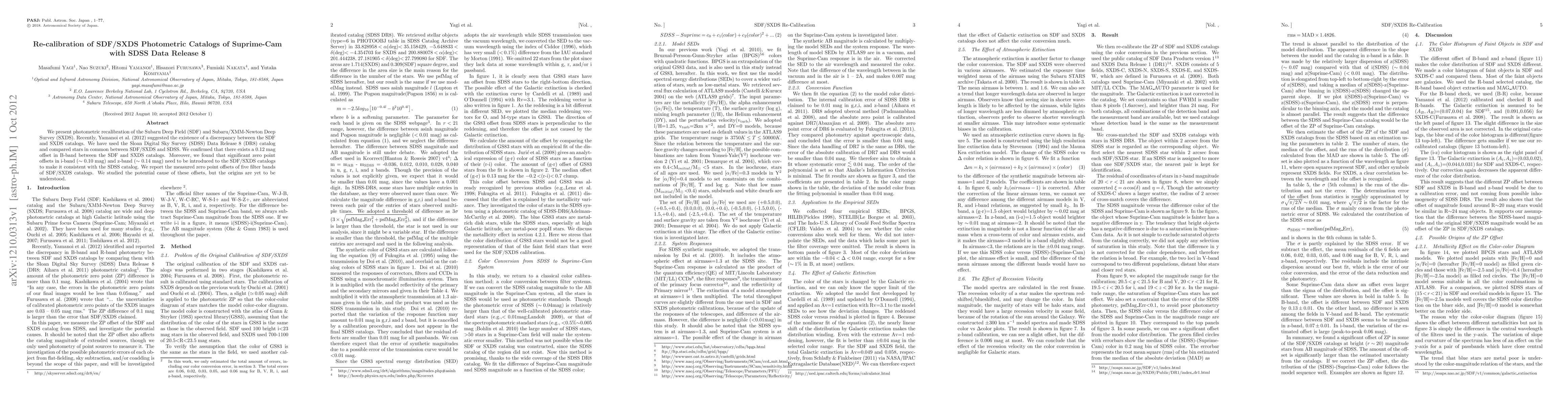 This paper recalibrates the Subaru Deep Field (SDF) and Subaru/XMM-Newton Deep Survey (SXDS) photometric catalogs using Sloan Digital Sky Survey (SDSS) Data Release 8 (DR8) data, confirming a 0.12 mag B-band offset and significant i-band (~0.10 mag) and z-band (~0.14 mag) offsets, while the origins of these discrepancies remain unclear.