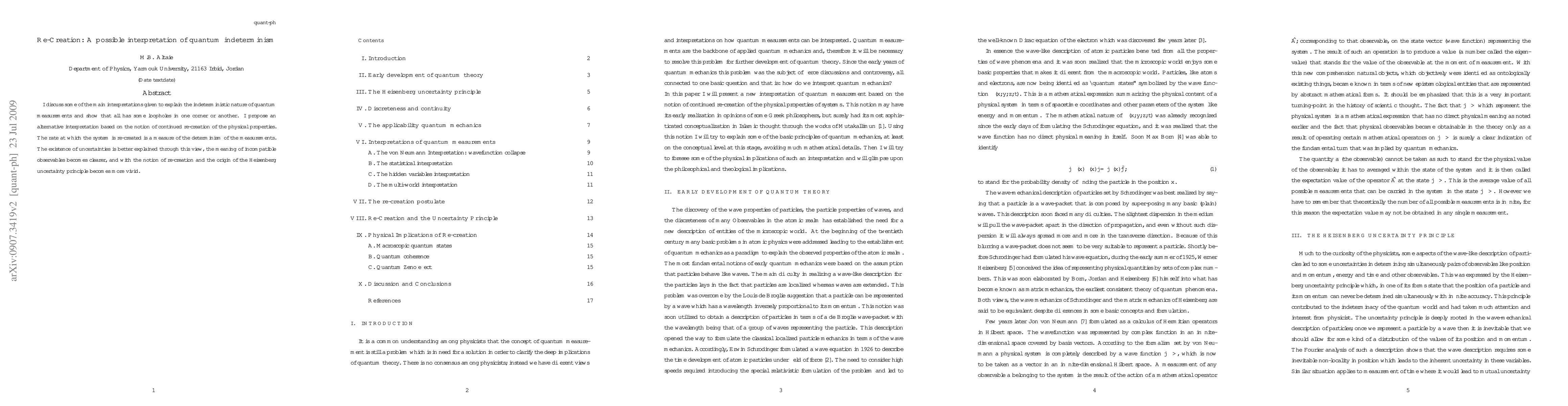 I discuss some of the main interpretations given to explain the indeterministic nature of quantum measurements and show that all has some loopholes in one corner or another. I propose an alternative interpretation based on the notion of continued re-creation of the physical properties. The rate at which the system is re-created is a measure of the determinism of the measurements. The existence of uncertainties is better explained through this view, the meaning of incompatible observables becomes clearer and with the notion of re-creation and the origin of the Heisenberg uncertainty principle becomes more vivid.