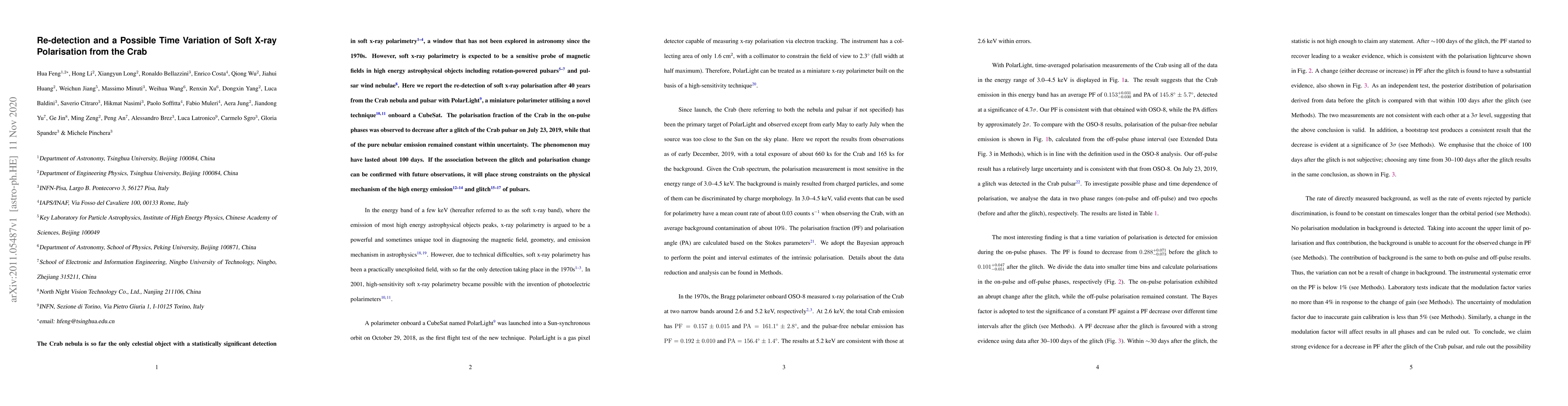 The Crab nebula is so far the only celestial object with a statistically significant detection in soft x-ray polarimetry, a window that has not been explored in astronomy since the 1970s. However, soft x-ray polarimetry is expected to be a sensitive probe of magnetic fields in high energy astrophysical objects including rotation-powered pulsars and pulsar wind nebulae. Here we report the re-detection of soft x-ray polarisation after 40 years from the Crab nebula and pulsar with PolarLight, a miniature polarimeter utilising a novel technique onboard a CubeSat. The polarisation fraction of the Crab in the on-pulse phases was observed to decrease after a glitch of the Crab pulsar on July 23, 2019, while that of the pure nebular emission remained constant within uncertainty. The phenomenon may have lasted about 100 days. If the association between the glitch and polarisation change can be confirmed with future observations, it will place strong constraints on the physical mechanism of the high energy emission and glitch of pulsars.