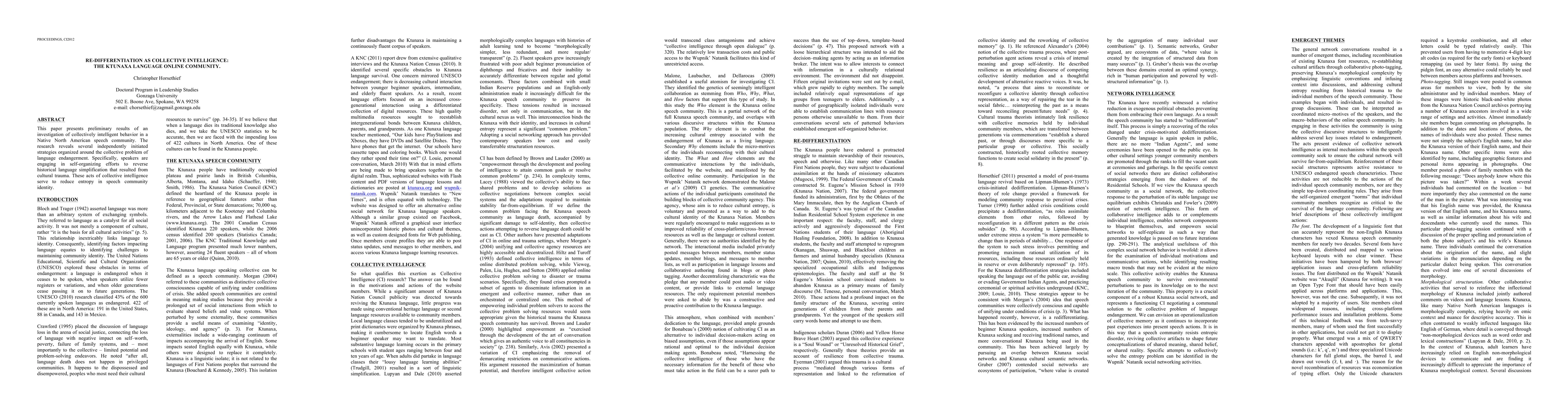 This paper presents preliminary results of an investigation of collectively intelligent behavior in a Native North American speech community. The research reveals several independently initiated strategies organized around the collective problem of language endangerment. Specifically, speakers are engaging in self-organizing efforts to reverse historical language simplification that resulted from cultural trauma. These acts of collective intelligence serve to reduce entropy in speech community identity.