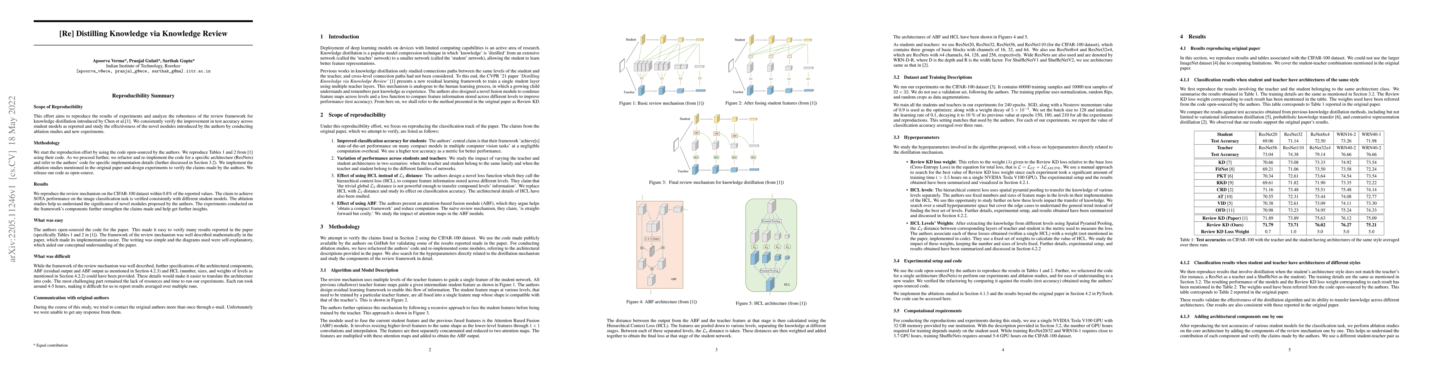 This effort aims to reproduce the results of experiments and analyze the robustness of the review framework for knowledge distillation introduced in the CVPR '21 paper 'Distilling Knowledge via Knowledge Review' by Chen et al. Previous works in knowledge distillation only studied connections paths between the same levels of the student and the teacher, and cross-level connection paths had not been considered. Chen et al. propose a new residual learning framework to train a single student layer using multiple teacher layers. They also design a novel fusion module to condense feature maps across levels and a loss function to compare feature information stored across different levels to improve performance. In this work, we consistently verify the improvements in test accuracy across student models as reported in the original paper and study the effectiveness of the novel modules introduced by conducting ablation studies and new experiments.