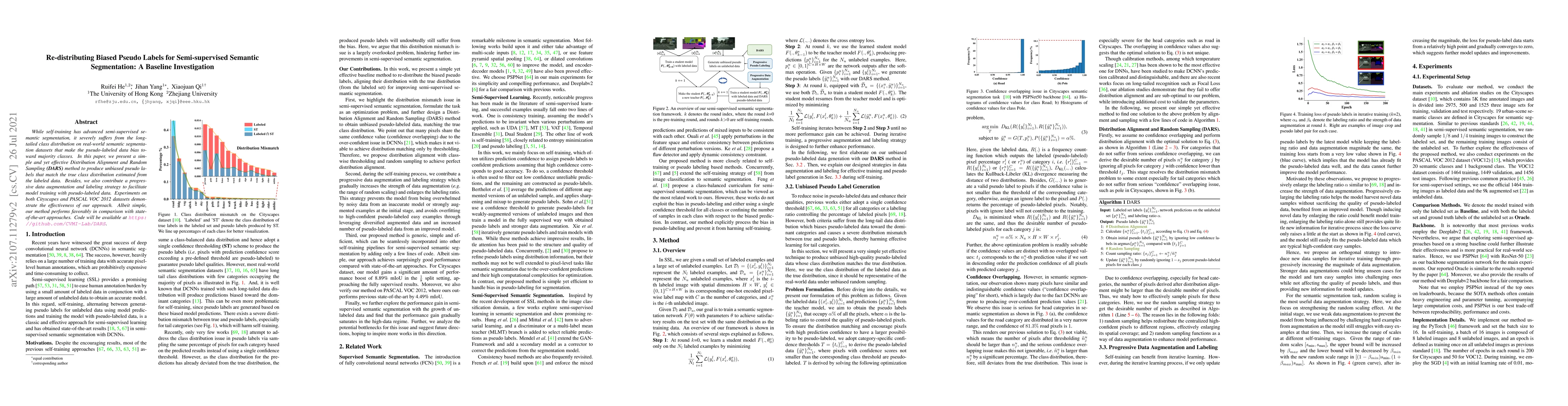 A new method called Distribution Alignment and Random Sampling (DARS) is proposed to reduce bias in pseudo labels for semi-supervised semantic segmentation, outperforming state-of-the-art approaches on Cityscapes and PASCAL VOC 2012 datasets.