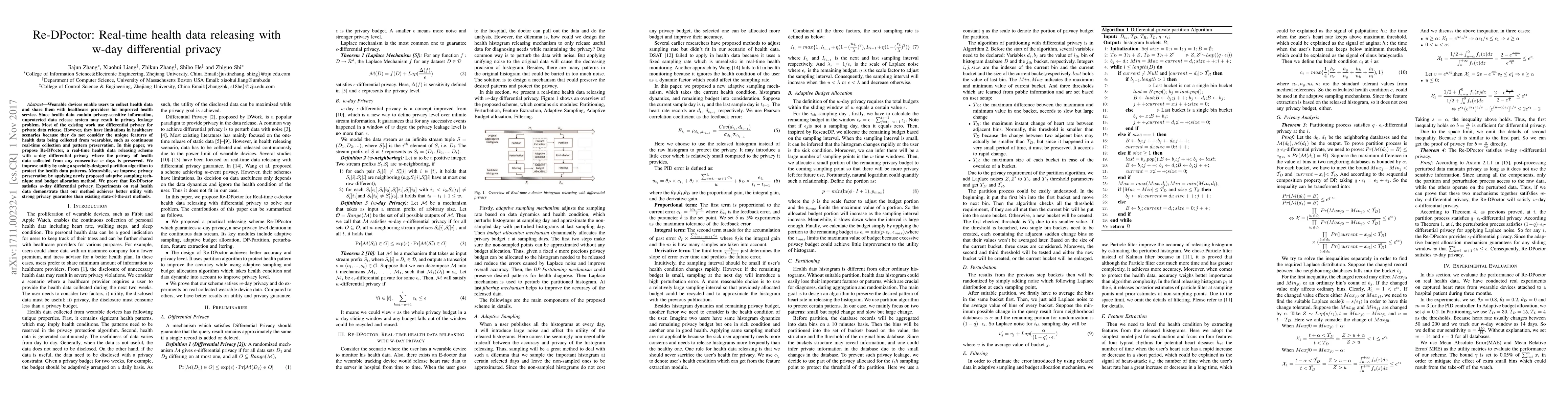 The paper proposes Re-DPoctor, a real-time health data releasing scheme with w-day differential privacy, designed for wearable health data with unique features like continuous real-time collection and pattern preservation.