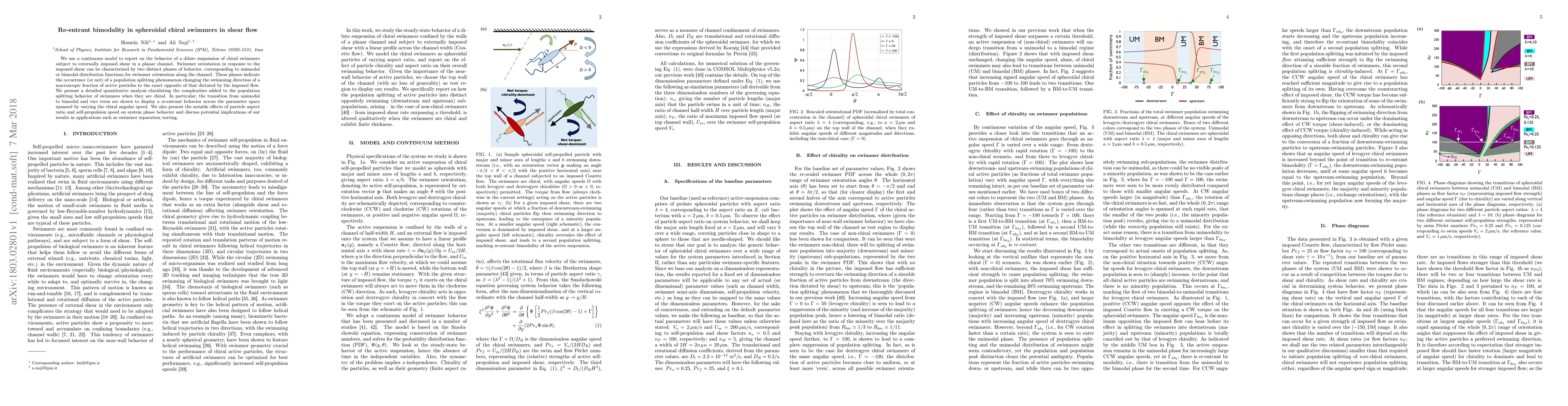 This paper investigates the behavior of chiral swimmers in shear flow, revealing a re-entrant bimodality in their orientation distribution. The study finds that chiral swimmers exhibit a population splitting phenomenon, with a transition between unimodal and bimodal orientation phases influenced by chiral angular speed, aspect ratio, and self-propulsion speed.