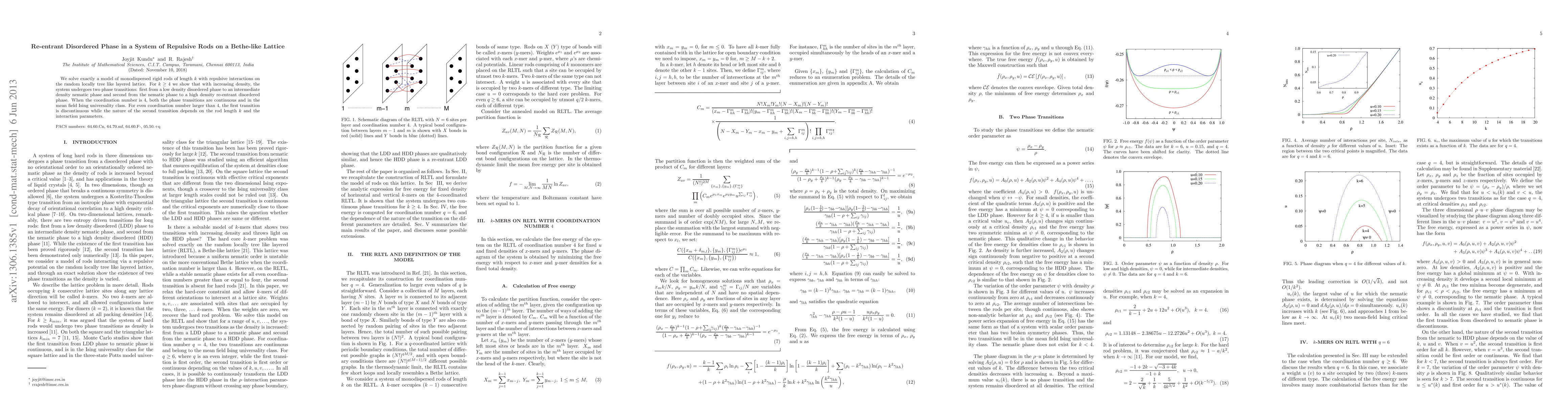 This paper exactly solves a model of rigid rods on a Bethe-like lattice, revealing two phase transitions: first from a disordered to a nematic phase, and then from nematic to a re-entrant disordered phase for rod lengths $k\geq 4$. The transitions' nature varies with coordination number and rod length.