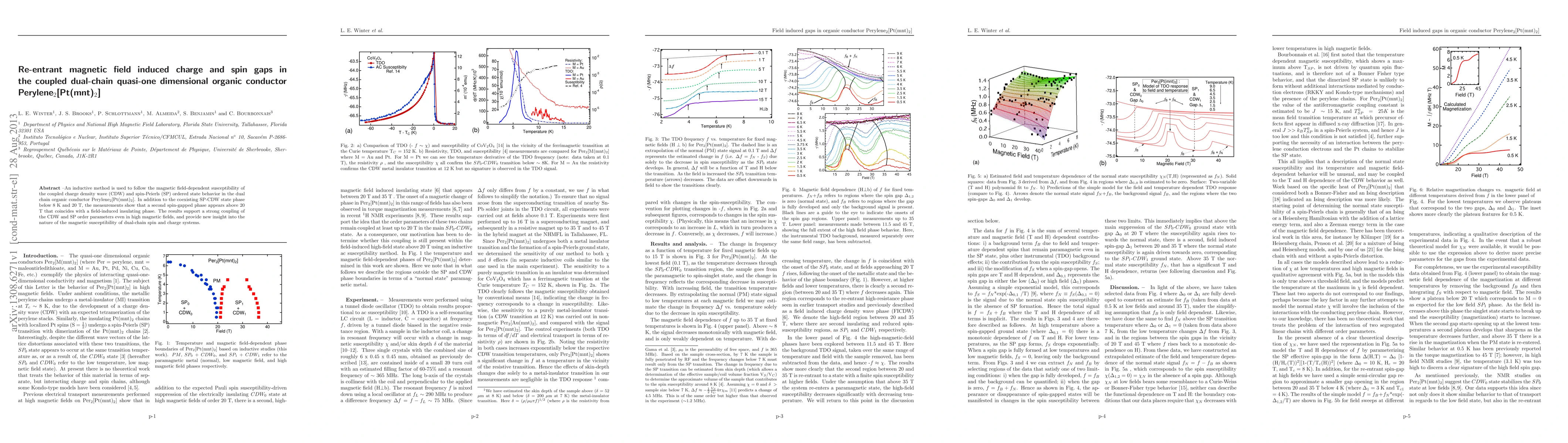 An inductive method is used to follow the magnetic field-dependent susceptibility of the coupled charge density wave (CDW) and spin-Peierls (SP) ordered state behavior in the dual chain organic conductor Perylene$_2$[Pt(mnt)$_2$]. In addition to the coexisting SP-CDW state phase below 8 K and 20 T, the measurements show that a second spin-gapped phase appears above 20 T that coincides with a field-induced insulating phase. The results support a strong coupling of the CDW and SP order parameters even in high magnetic fields, and provide new insight into the nature of the magnetic susceptibility of dual-chain spin and charge systems.