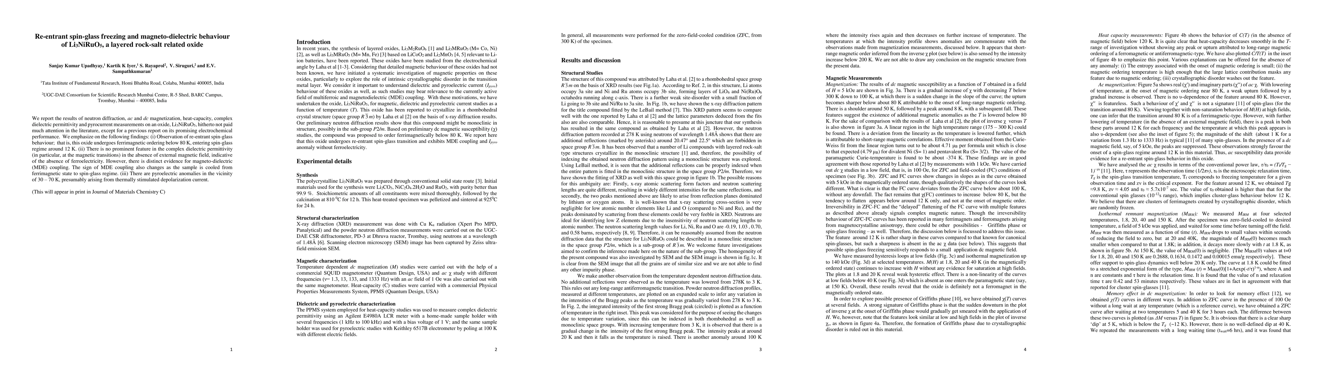 Researchers investigated Li3NiRuO6, a layered rock-salt oxide, revealing re-entrant spin-glass behavior and magneto-dielectric properties with changes in coupling as the sample cools.
