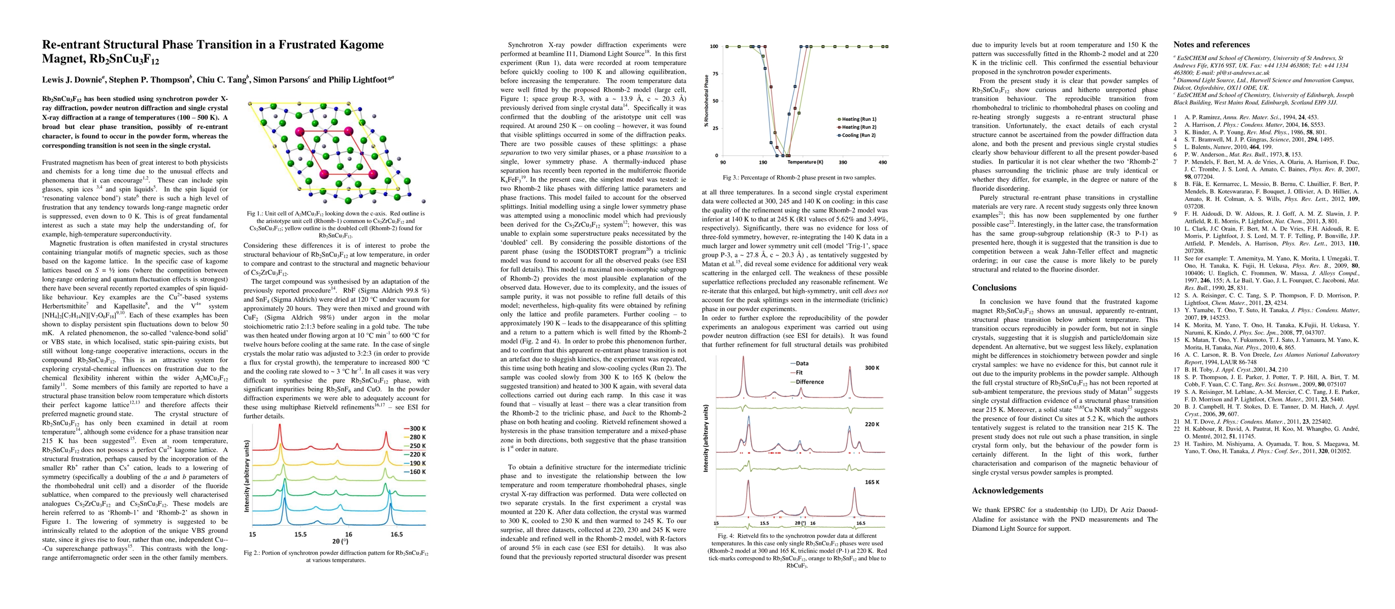 This study reveals a re-entrant structural phase transition in Rb2SnCu3F12 observed via synchrotron and neutron diffraction, with a transition occurring in powdered samples but not in single crystals. The exact nature of the transition remains unclear due to its broad and ambiguous characteristics.