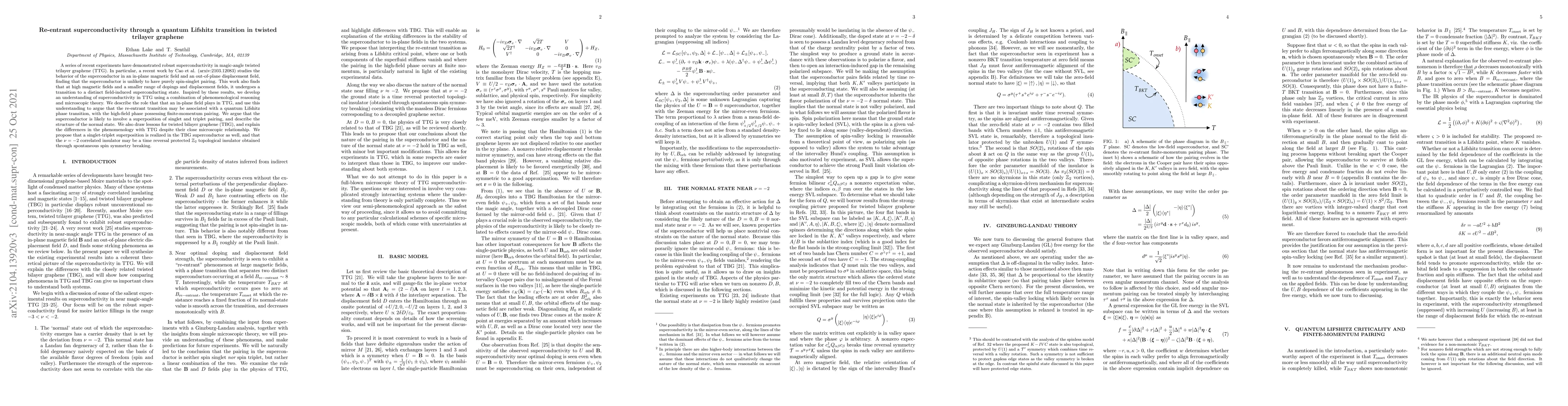 A series of recent experiments have demonstrated robust superconductivity in magic-angle twisted trilayer graphene (TTG). In particular, a recent work by Cao et al. (arxiv:2103.12083) studies the behavior of the superconductor in an in-plane magnetic field and out-of-plane displacement field, finding that the superconductor is unlikely to be spin-singlet. This work also finds that at high magnetic fields and a smaller range of dopings and displacement fields, it undergoes a transition to a distinct field-induced superconducting state. Inspired by these results, we develop an understanding of superconductivity in TTG using a combination of phenomenological reasoning and microscopic theory. We describe role that that an in-plane field plays in TTG, and use this understanding to argue that the re-entrant transition may be associated with a quantum Lifshitz phase transition, with the high-field phase possessing finite-momentum pairing. We argue that the superconductor is likely to involve a superposition of singlet singlet and triplet pairing, and describe the structure of the normal state. We also draw lessons for twisted bilayer graphene (TBG), and explain the differences in the phenomenology with TTG despite their close microscopic relationship. We propose that a singlet-triplet superposition is realized in the TBG superconductor as well, and that the $\nu = -2$ correlated insulator may be a time reversal protected $\mathbb{Z}_2$ topological insulator obtained through spontaneous spin symmetry breaking.