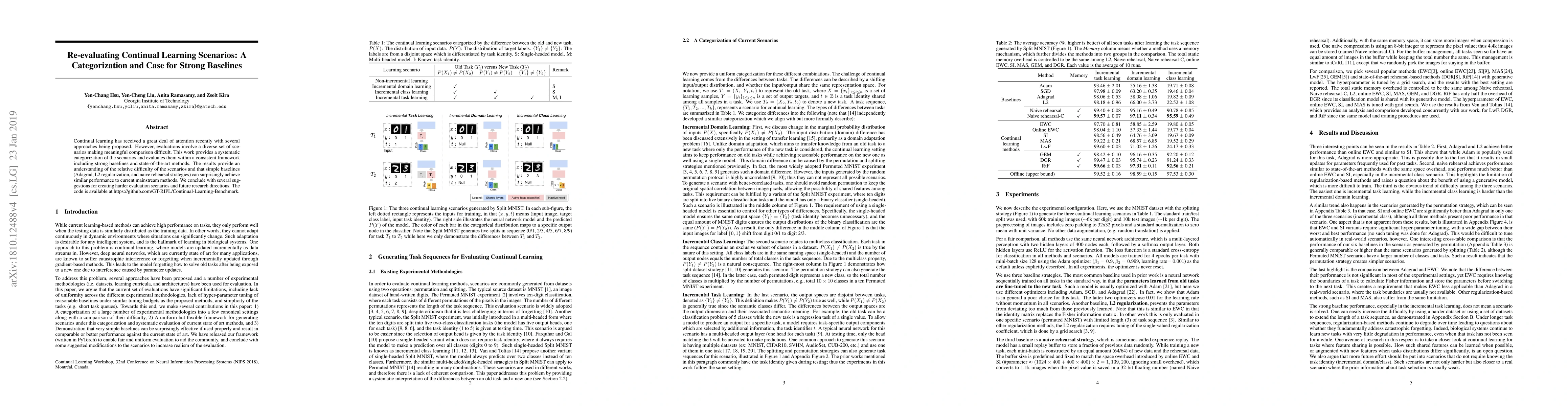 This paper categorizes continual learning scenarios and evaluates them using strong baselines and state-of-the-art methods, revealing that simple strategies can perform similarly to complex approaches. The study suggests creating more challenging evaluation scenarios and proposes future research directions.