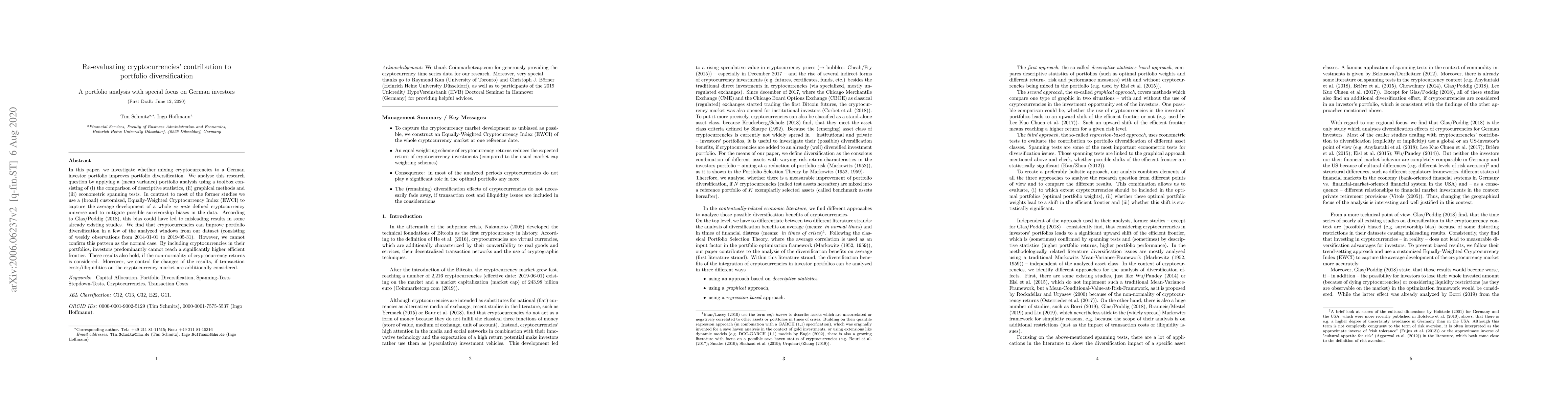 This study examines if integrating cryptocurrencies into German investors' portfolios enhances diversification using mean-variance portfolio analysis. Results show mixed improvement in diversification, suggesting cryptocurrencies do not universally elevate the efficient frontier, even when accounting for non-normal returns and transaction costs.