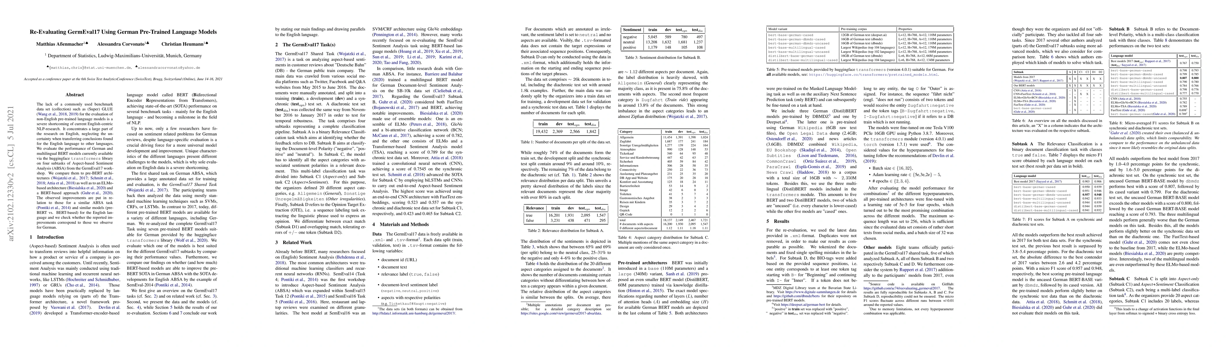 The lack of a commonly used benchmark data set (collection) such as (Super-)GLUE (Wang et al., 2018, 2019) for the evaluation of non-English pre-trained language models is a severe shortcoming of current English-centric NLP-research. It concentrates a large part of the research on English, neglecting the uncertainty when transferring conclusions found for the English language to other languages. We evaluate the performance of the German and multilingual BERT-based models currently available via the huggingface transformers library on the four tasks of the GermEval17 workshop. We compare them to pre-BERT architectures (Wojatzki et al., 2017; Schmitt et al., 2018; Attia et al., 2018) as well as to an ELMo-based architecture (Biesialska et al., 2020) and a BERT-based approach (Guhr et al., 2020). The observed improvements are put in relation to those for similar tasks and similar models (pre-BERT vs. BERT-based) for the English language in order to draw tentative conclusions about whether the observed improvements are transferable to German or potentially other related languages.
