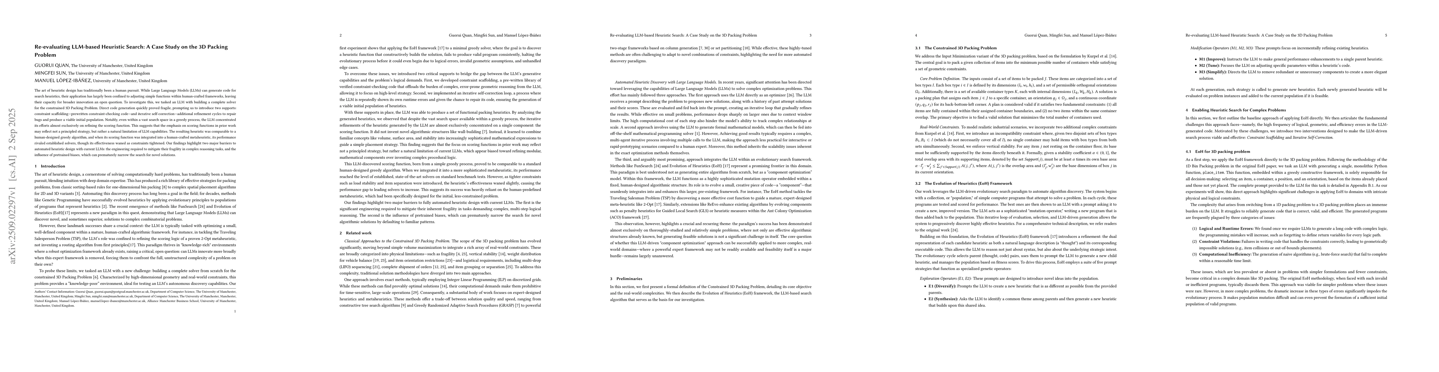 The art of heuristic design has traditionally been a human pursuit. While Large Language Models (LLMs) can generate code for search heuristics, their application has largely been confined to adjusting simple functions within human-crafted frameworks, leaving their capacity for broader innovation an open question. To investigate this, we tasked an LLM with building a complete solver for the constrained 3D Packing Problem. Direct code generation quickly proved fragile, prompting us to introduce two supports: constraint scaffolding--prewritten constraint-checking code--and iterative self-correction--additional refinement cycles to repair bugs and produce a viable initial population. Notably, even within a vast search space in a greedy process, the LLM concentrated its efforts almost exclusively on refining the scoring function. This suggests that the emphasis on scoring functions in prior work may reflect not a principled strategy, but rather a natural limitation of LLM capabilities. The resulting heuristic was comparable to a human-designed greedy algorithm, and when its scoring function was integrated into a human-crafted metaheuristic, its performance rivaled established solvers, though its effectiveness waned as constraints tightened. Our findings highlight two major barriers to automated heuristic design with current LLMs: the engineering required to mitigate their fragility in complex reasoning tasks, and the influence of pretrained biases, which can prematurely narrow the search for novel solutions.