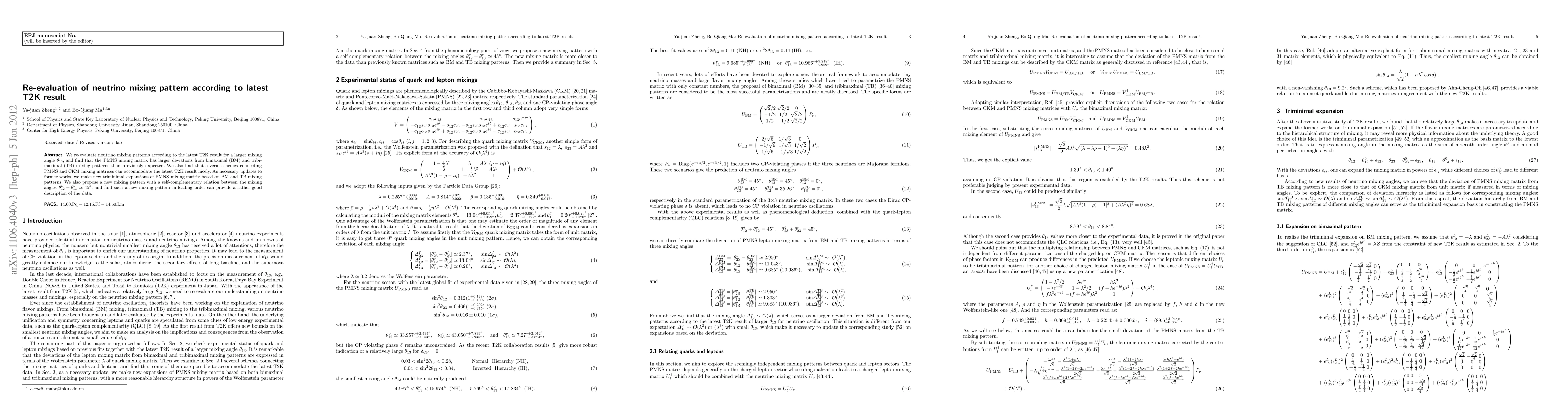 We re-evaluate neutrino mixing patterns according to the latest T2K result for a larger mixing angle $\theta_{13}$, and find that the PMNS mixing matrix has larger deviations from bimaximal (BM) and tribimaximal (TB) mixing patterns than previously expected. We also find that several schemes connecting PMNS and CKM mixing matrices can accommodate the latest T2K result nicely. As necessary updates to former works, we make new triminimal expansions of PMNS mixing matrix based on BM and TB mixing patterns. We also propose a new mixing pattern with a self-complementary relation between the mixing angles $\theta_{12}^{\nu} + \theta_{13}^{\nu} \simeq 45^\circ$, and find such a new mixing pattern in leading order can provide a rather good description of the data.