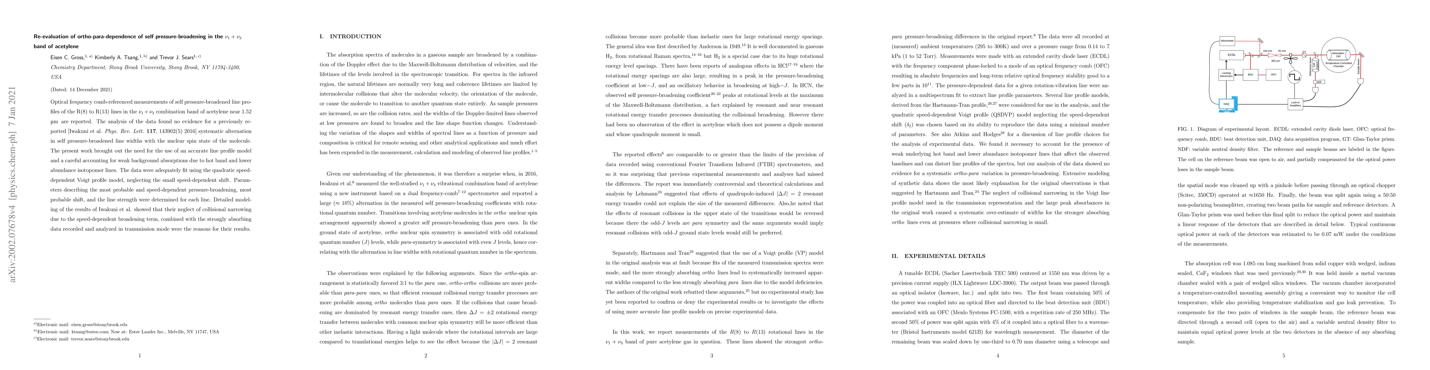 Optical frequency comb-referenced measurements of self pressure-broadened line profiles of the R(8) to R(13) lines in the \thisband combination band of acetylene near 1.52$\mu$m are reported. The analysis of the data found no evidence for a previously reported [Iwakuni et al. \textit{Phys. Rev. Letts.} \textbf{117}, 143902(5) 2016] systematic alternation in self pressure-broadened line widths with the nuclear spin state of the molecule. The present work brought out the need for the use of an accurate line profile model and a careful accounting for weak background absorptions due to hot-band and lower abundance isotopomer lines. The data were adequately fit using the quadratic speed-dependent Voigt profile model, neglecting the small speed-dependent shift. Parameters describing the most probable and speed-dependent pressure-broadening, most probable shift, and the line strength were determined for each line. Detailed modeling of the results of Iwakuni et al. showed that their neglect of collisional narrowing due to the speed-dependent broadening term, combined with the strongly absorbing data recorded and analyzed in transmission mode were likely the reasons for their results.