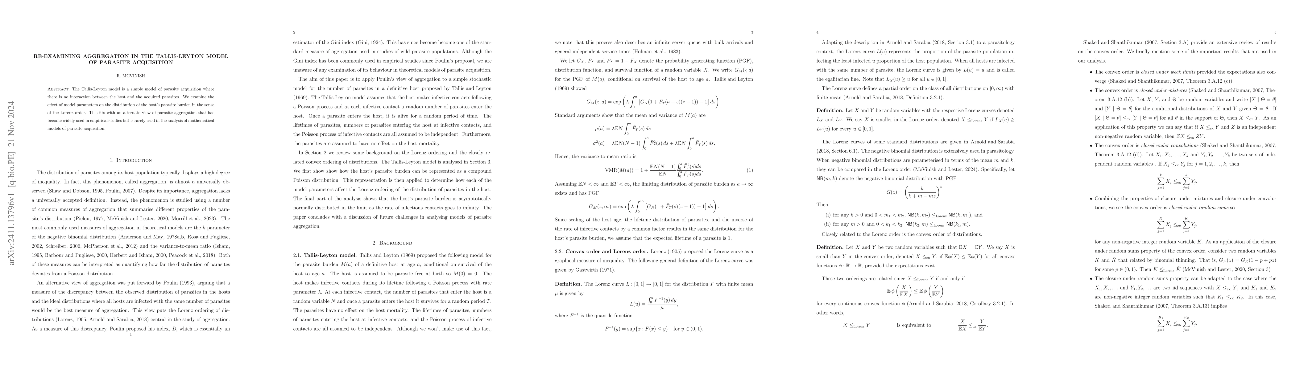This paper re-examines the Tallis-Leyton model of parasite acquisition, focusing on the impact of model parameters on the Lorenz order of host parasite burden distribution, providing a new perspective on parasite aggregation not commonly analyzed in mathematical models.