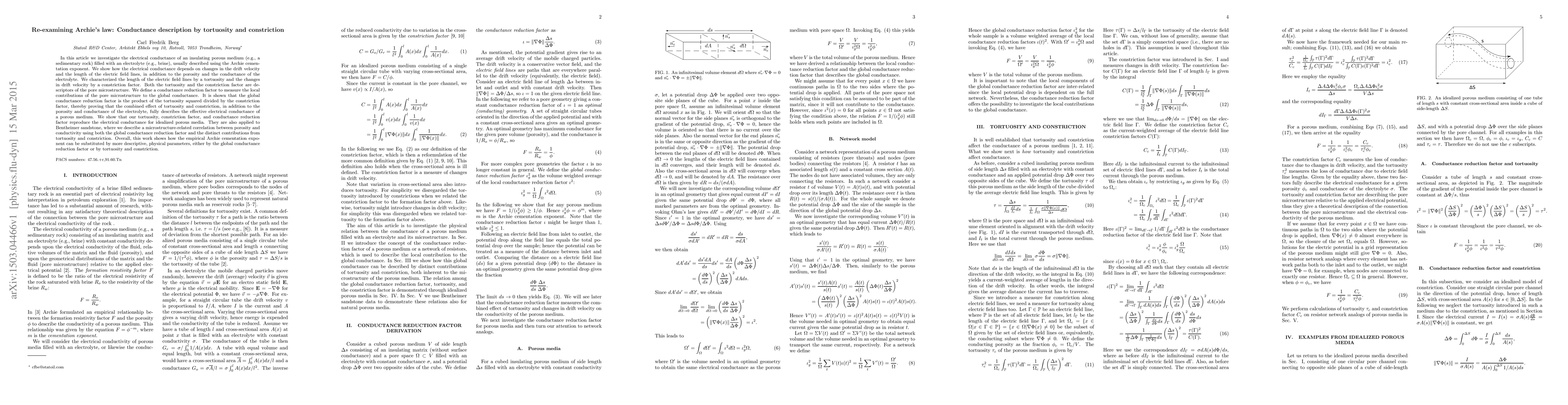 This paper re-examines Archie's law to describe electrical conductance in porous media, introducing tortuosity and constriction factors to better characterize the pore microstructure. It shows that the effective electrical conductance is fully described by the combined effect of these factors, porosity, and electrolyte conductance.