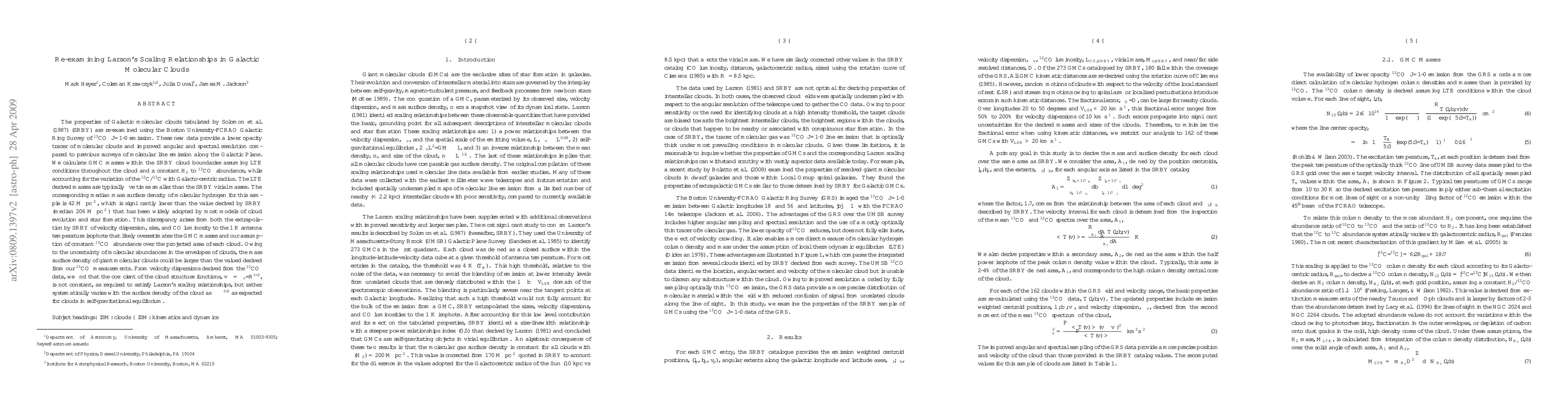 The paper presents improved mass estimates for Galactic molecular clouds using 13CO J=1-0 emission data and highlights the variation of the velocity structure function coefficient with cloud surface density.