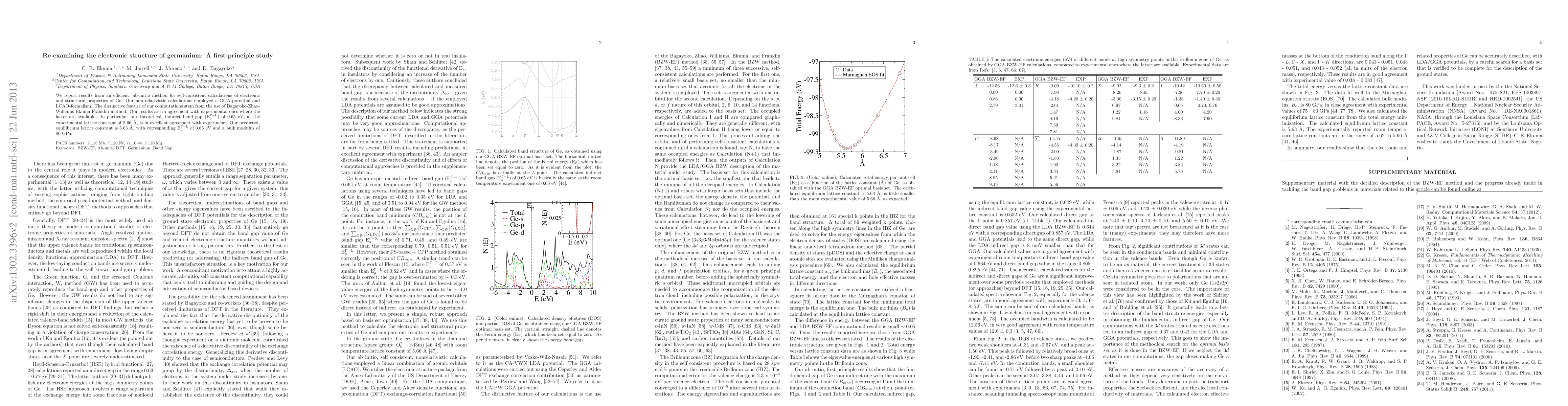 We report results from an efficient, robust, ab-initio method for self-consistent calculations of electronic and structural properties of Ge. Our non-relativistic calculations employed a generalized gradient approximation (GGA) potential and the linear combination of atomic orbitals (LCAO) formalism. The distinctive feature of our computations stem from the use of Bagayoko-Zhao-Williams-Ekuma-Franklin (BZW-EF) method. Our results are in agreement with experimental ones where the latter are available. In particular, our theoretical, indirect band gap of 0.65 eV, at the experimental lattice constant of 5.66 \AA{}, is in excellent agreement with experiment. Our predicted, equilibrium lattice constant is 5.63 \AA{}, with a corresponding indirect band gap of 0.65 eV and a bulk modulus of 80 GPa. We also calculated the effective masses in various directions with respect to the $\Gamma$ point.