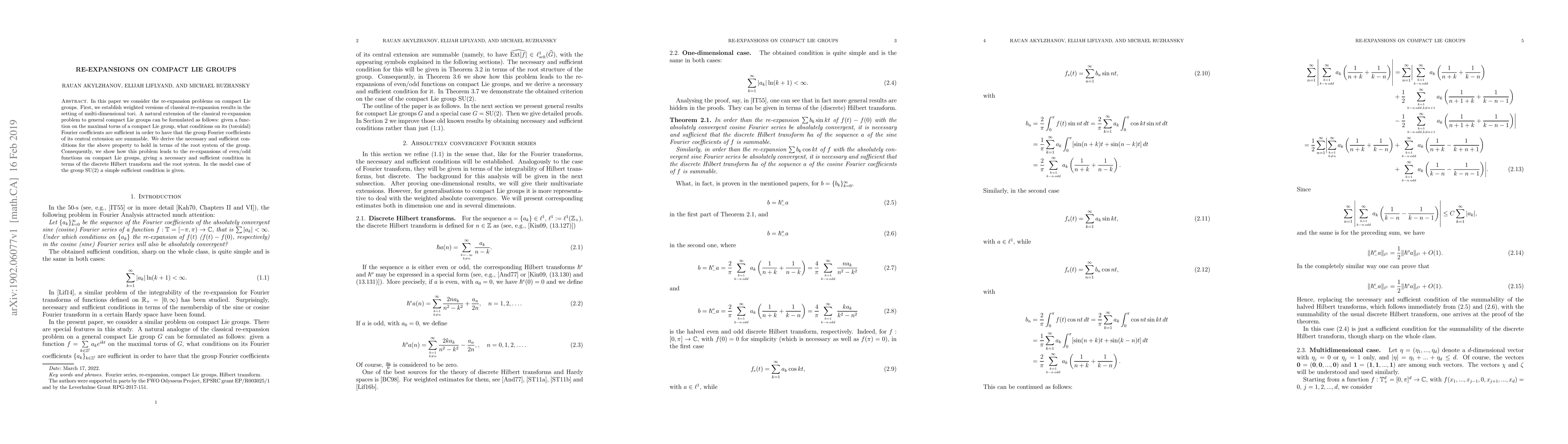 In this paper we consider the re-expansion problems on compact Lie groups. First, we establish weighted versions of classical re-expansion results in the setting of multi-dimensional tori. A natural extension of the classical re-expansion problem to general compact Lie groups can be formulated as follows: given a function on the maximal torus of a compact Lie group, what conditions on its (toroidal) Fourier coefficients are sufficient in order to have that the group Fourier coefficients of its central extension are summable. We derive the necessary and sufficient conditions for the above property to hold in terms of the root system of the group. Consequently, we show how this problem leads to the re-expansions of even/odd functions on compact Lie groups, giving a necessary and sufficient condition in terms of the discrete Hilbert transform and the root system. In the model case of the group SU(2) a simple sufficient condition is given.