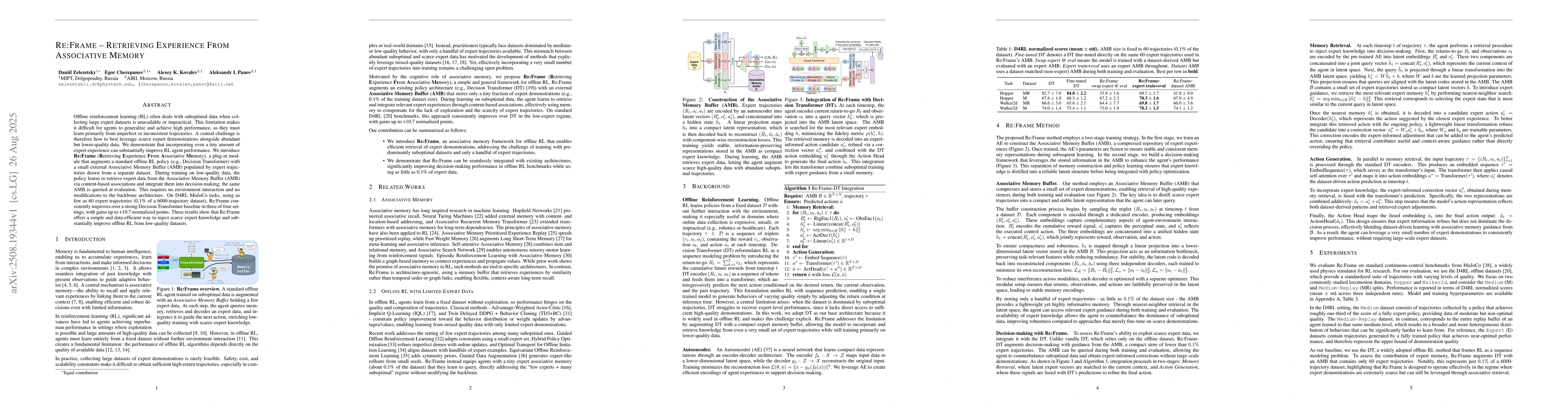 Offline reinforcement learning (RL) often deals with suboptimal data when collecting large expert datasets is unavailable or impractical. This limitation makes it difficult for agents to generalize and achieve high performance, as they must learn primarily from imperfect or inconsistent trajectories. A central challenge is therefore how to best leverage scarce expert demonstrations alongside abundant but lower-quality data. We demonstrate that incorporating even a tiny amount of expert experience can substantially improve RL agent performance. We introduce Re:Frame (Retrieving Experience From Associative Memory), a plug-in module that augments a standard offline RL policy (e.g., Decision Transformer) with a small external Associative Memory Buffer (AMB) populated by expert trajectories drawn from a separate dataset. During training on low-quality data, the policy learns to retrieve expert data from the Associative Memory Buffer (AMB) via content-based associations and integrate them into decision-making; the same AMB is queried at evaluation. This requires no environment interaction and no modifications to the backbone architecture. On D4RL MuJoCo tasks, using as few as 60 expert trajectories (0.1% of a 6000-trajectory dataset), Re:Frame consistently improves over a strong Decision Transformer baseline in three of four settings, with gains up to +10.7 normalized points. These results show that Re:Frame offers a simple and data-efficient way to inject scarce expert knowledge and substantially improve offline RL from low-quality datasets.