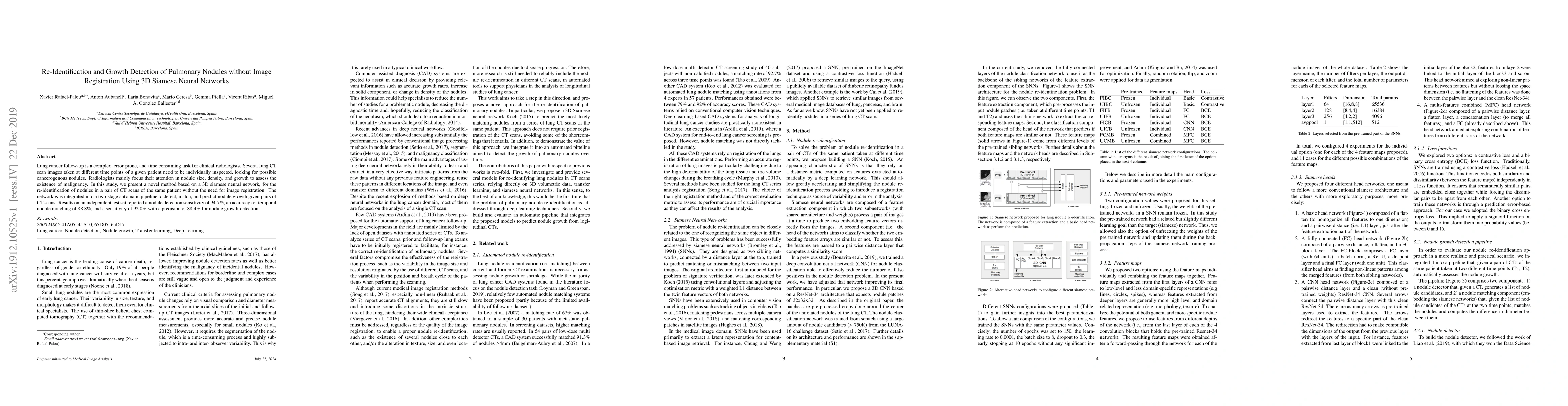 This paper introduces a 3D Siamese neural network for re-identifying pulmonary nodules in CT scans without image registration, achieving 94.7% detection sensitivity and 88.8% accuracy in matching nodules over time, along with 92.0% sensitivity and 88.4% precision for growth detection.