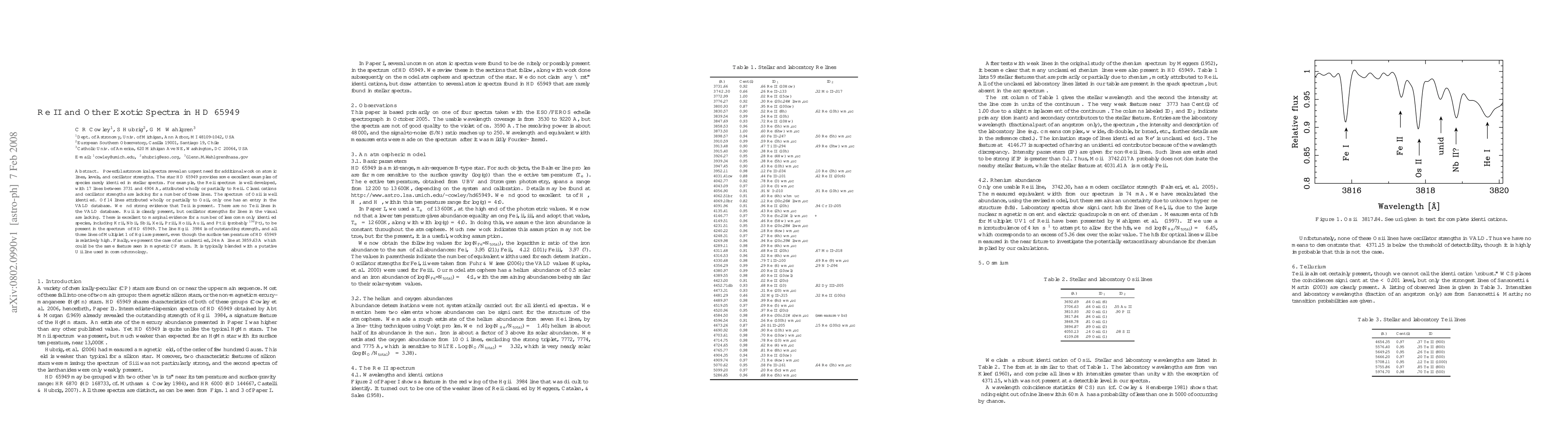 Powerful astronomical spectra reveal an urgent need for additional work on atomic lines, levels, and oscillator strengths. The star HD 65949 provides some excellent examples of species rarely identified in stellar spectra. For example, the Re II spectrum is well developed, with 17 lines between 3731 and 4904 [A], attributed wholly or partially to Re II. Classifications and oscillator strengths are lacking for a number of these lines. The spectrum of Os II is well identified. Of 14 lines attributed wholly or partially to Os II, only one has an entry in the VALD database. We find strong evidence that Te II is present. There are NO Te II lines in the VALD database. Ru II is clearly present, but oscillator strengths for lines in the visual are lacking. There is excellent to marginal evidence for a number of less commonly identified species, including Kr II, Nb II, Sb II, Xe II, Pr III, Ho III, Au II, and Pt II (probably Pt-198), to be present in the spectrum of HD 65949. The line Hg II at 3984 [A] is of outstanding strength, and all three lines of Multiplet 1 of Hg I are present, even though the surface temperature of HD 65949 is relatively high. Finally, we present the case of an unidentified, 24 [mA], line at 3859.63 [A], which could be the same feature seen in magnetic CP stars. It is typically blended with a putative U II line used in cosmochronology.