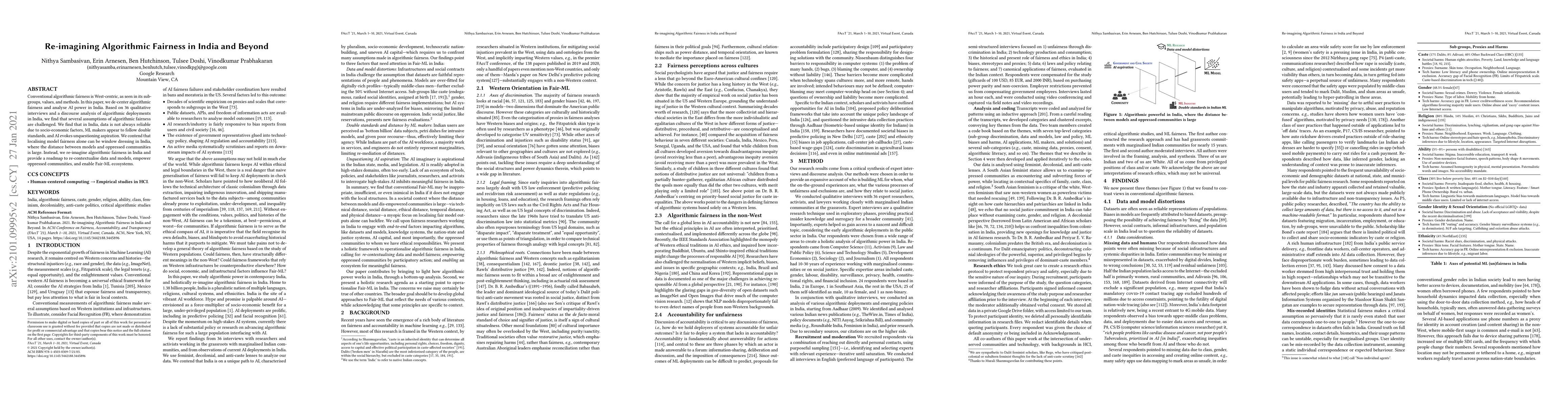 Researchers de-center algorithmic fairness by analyzing AI in India, finding challenges with data reliability, double standards among ML makers, and unquestioning aspirations, advocating for a re-imagined approach to fair machine learning.