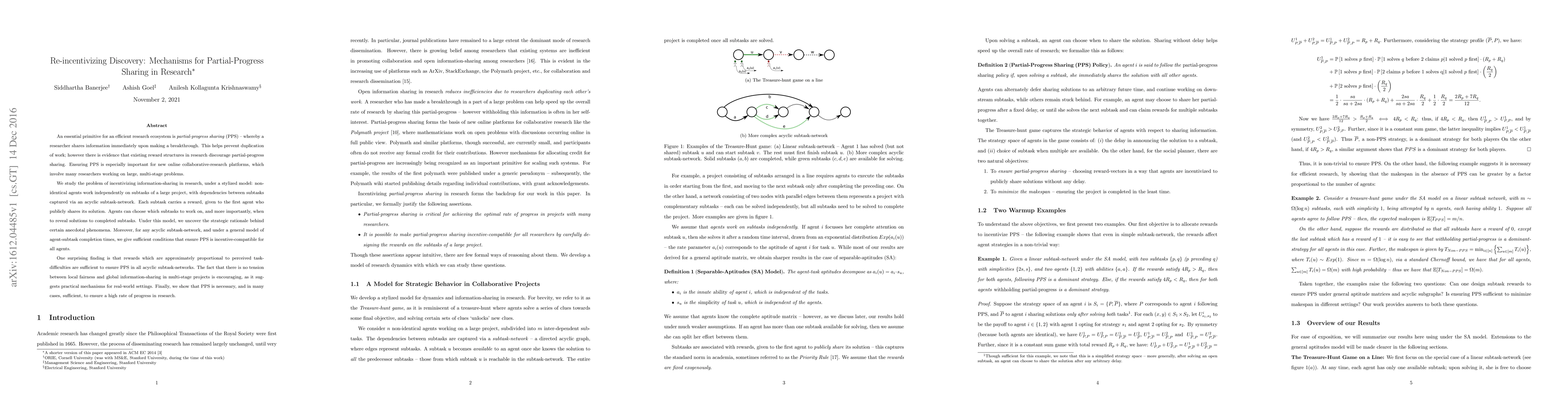 An essential primitive for an efficient research ecosystem is \emph{partial-progress sharing} (PPS) -- whereby a researcher shares information immediately upon making a breakthrough. This helps prevent duplication of work; however there is evidence that existing reward structures in research discourage partial-progress sharing. Ensuring PPS is especially important for new online collaborative-research platforms, which involve many researchers working on large, multi-stage problems. We study the problem of incentivizing information-sharing in research, under a stylized model: non-identical agents work independently on subtasks of a large project, with dependencies between subtasks captured via an acyclic subtask-network. Each subtask carries a reward, given to the first agent who publicly shares its solution. Agents can choose which subtasks to work on, and more importantly, when to reveal solutions to completed subtasks. Under this model, we uncover the strategic rationale behind certain anecdotal phenomena. Moreover, for any acyclic subtask-network, and under a general model of agent-subtask completion times, we give sufficient conditions that ensure PPS is incentive-compatible for all agents. One surprising finding is that rewards which are approximately proportional to perceived task-difficulties are sufficient to ensure PPS in all acyclic subtask-networks. The fact that there is no tension between local fairness and global information-sharing in multi-stage projects is encouraging, as it suggests practical mechanisms for real-world settings. Finally, we show that PPS is necessary, and in many cases, sufficient, to ensure a high rate of progress in research.
