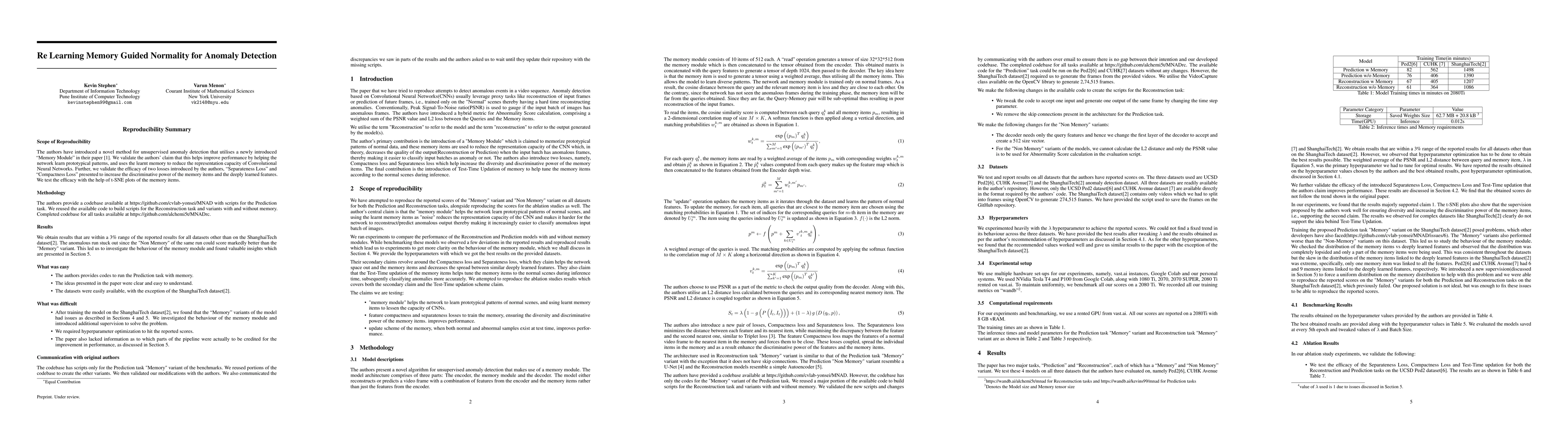 The authors have introduced a novel method for unsupervised anomaly detection that utilises a newly introduced Memory Module in their paper. We validate the authors claim that this helps improve performance by helping the network learn prototypical patterns, and uses the learnt memory to reduce the representation capacity of Convolutional Neural Networks. Further, we validate the efficacy of two losses introduced by the authors, Separateness Loss and Compactness Loss presented to increase the discriminative power of the memory items and the deeply learned features. We test the efficacy with the help of t-SNE plots of the memory items.