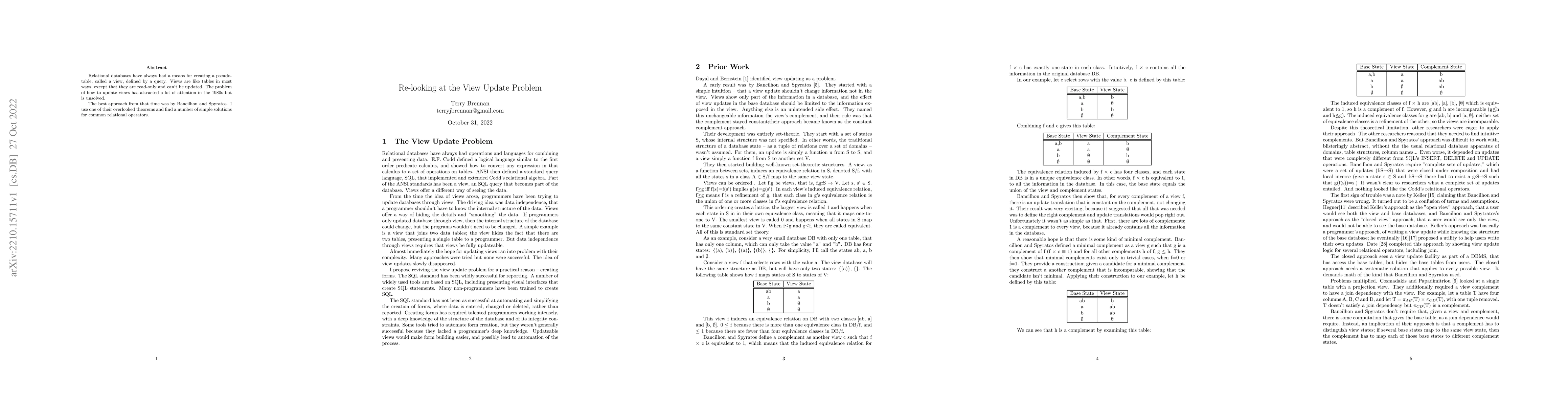 This paper revisits the unsolved "view update problem" in relational databases, proposing simple solutions for updating views based on an overlooked theorem from Bancilhon and Spyratos' 1980s work. It focuses on common relational operators to address this long-standing issue.
