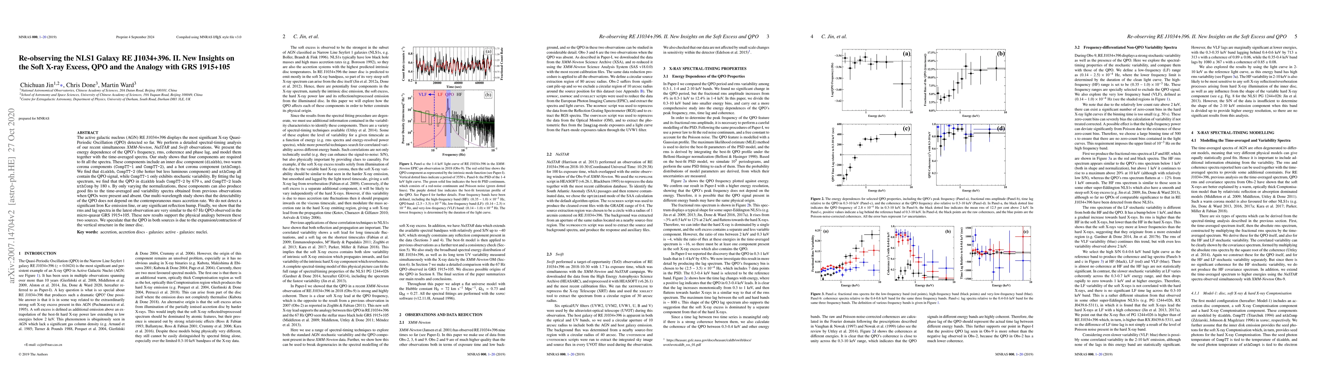 This study details a spectral-timing analysis of RE J1034+396, an active galactic nucleus with a strong X-ray Quasi-Periodic Oscillation (QPO). Four components - an inner disc, two warm coronae, and a hot corona - were found to fit the spectra. The QPO is present in the inner disc, hotter warm corona, and hot corona components, but not in the cooler warm corona. The QPO lag was found to align with GRS 1915+105, suggesting a common physical mechanism. No significant Iron Kα emission line or reflection hump was detected, and QPO detectability doesn't depend on mass accretion rate.