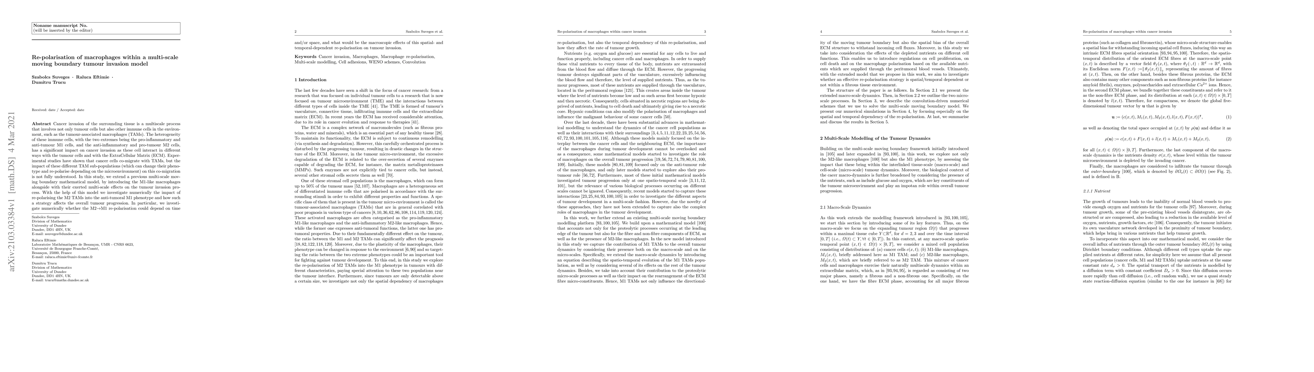 Cancer invasion of the surrounding tissue is a multiscale process that involves not only tumour cells but also other immune cells in the environment, such as the tumour-associated macrophages (TAMs). The heterogeneity of these immune cells, with the two extremes being the pro-inflammatory and anti-tumour M1 cells, and the anti-inflammatory and pro-tumour M2 cells, has a significant impact on cancer invasion as these cell interact in different ways with the tumour cells and with the ExtraCellular Matrix (ECM). Experimental studies have shown that cancer cells co-migrate with TAMs, but the impact of these different TAM sub-populations (which can change their phenotype and re-polarise depending on the microenvironment) on this co-migration is not fully understood. In this study, we extend a previous multi-scale moving boundary mathematical model, by introducing the M1-like macrophages alongside with their exerted multi-scale effects on the tumour invasion process. With the help of this model we investigate numerically the impact of re-polarising the M2 TAMs into the anti-tumoral M1 phenotype and how such a strategy affects the overall tumour progression. In particular, we investigate numerically whether the M2-->M1 re-polarisation could depend on time and/or space, and what would be the macroscopic effects of this spatial- and temporal-dependent re-polarisation on tumour invasion.