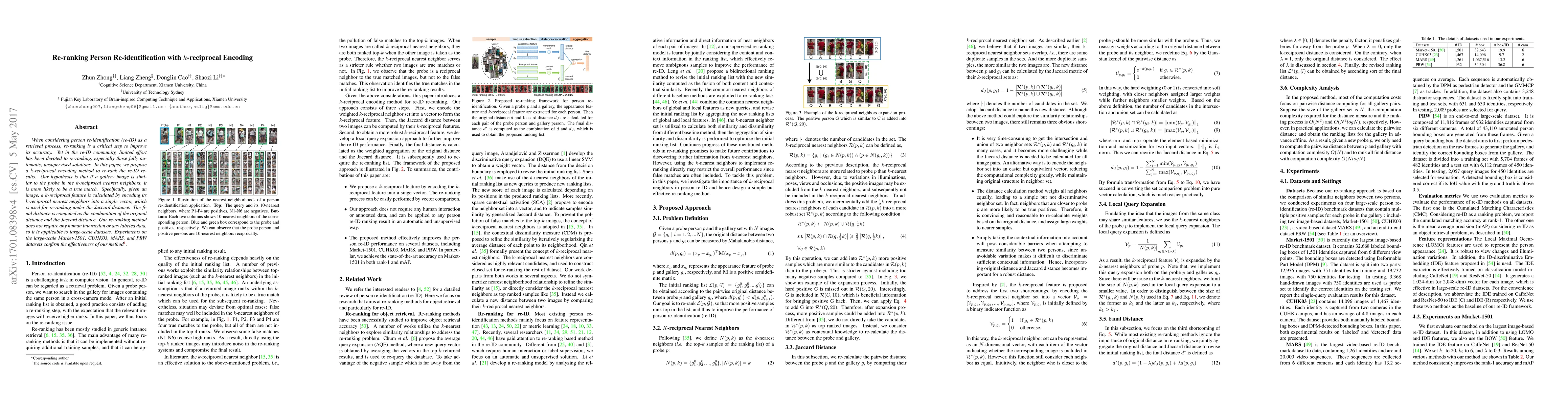 This paper proposes a k-reciprocal encoding method for re-ranking in person re-identification, aiming to improve retrieval accuracy without human interaction or labeled data. The method calculates a k-reciprocal feature for re-ranking based on the Jaccard distance, demonstrating effectiveness on several large-scale datasets.