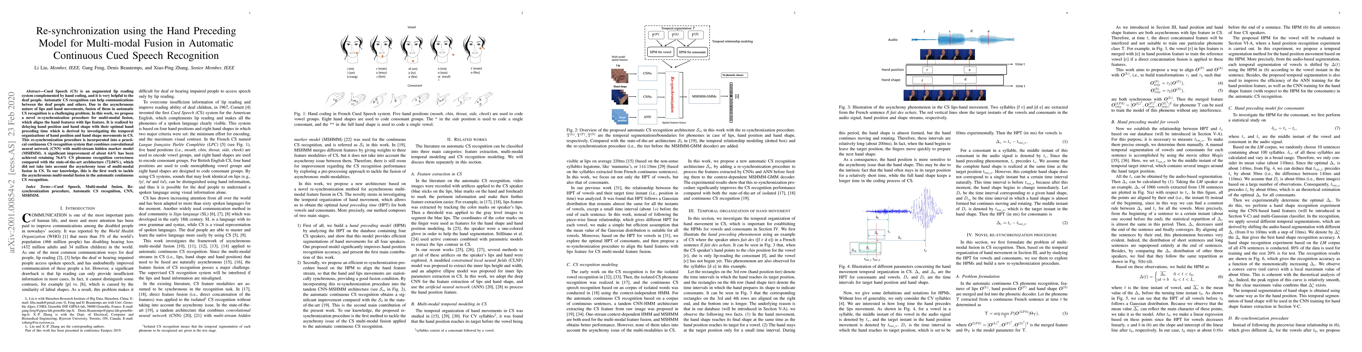 This paper proposes a novel re-synchronization model using hand preceding time to align hand features with lip features for improved automatic continuous Cued Speech recognition, achieving a 4.6% improvement over existing methods. The model integrates convolutional neural networks with a multi-stream hidden Markov model, addressing the challenge of asynchronous multi-modal fusion in CS recognition.