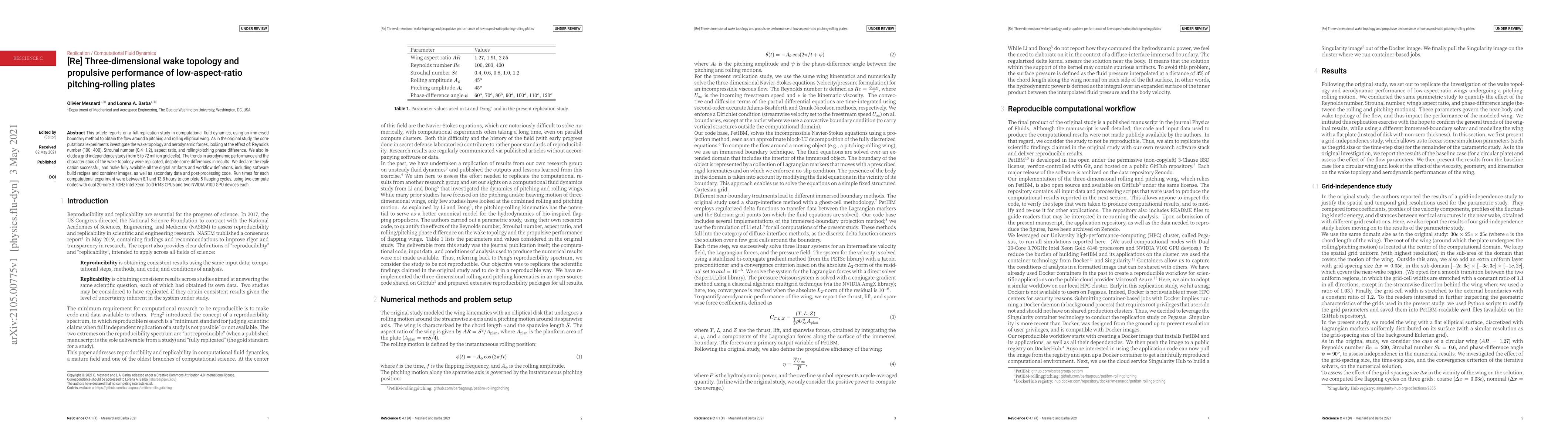 This article reports on a full replication study in computational fluid dynamics, using an immersed boundary method to obtain the flow around a pitching and rolling elliptical wing. As in the original study, the computational experiments investigate the wake topology and aerodynamic forces, looking at the effect of: Reynolds number (100--400), Strouhal number (0.4--1.2), aspect ratio, and rolling/pitching phase difference. We also include a grid-independence study (from 5 to 72 million grid cells). The trends in aerodynamic performance and the characteristics of the wake topology were replicated, despite some differences in results. We declare the replication successful, and make fully available all the digital artifacts and workflow definitions, including software build recipes and container images, as well as secondary data and post-processing code. Run times for each computational experiment were between 8.1 and 13.8 hours to complete 5 flapping cycles, using two compute nodes with dual 20-core 3.7GHz Intel Xeon Gold 6148 CPUs and two NVIDIA V100 GPU devices each.