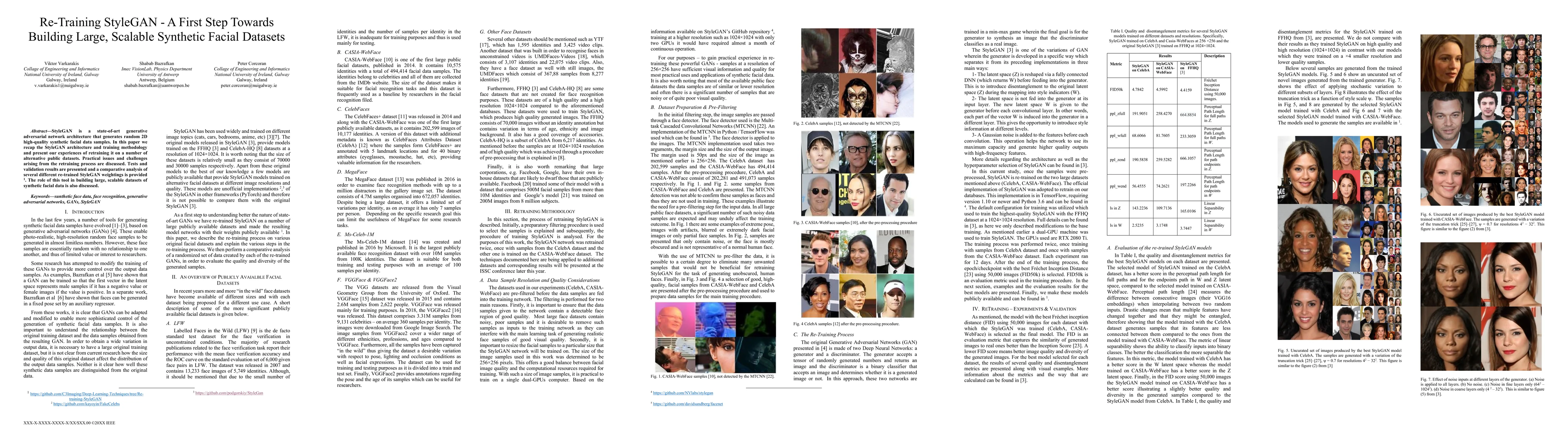 StyleGAN is a state-of-art generative adversarial network architecture that generates random 2D high-quality synthetic facial data samples. In this paper, we recap the StyleGAN architecture and training methodology and present our experiences of retraining it on a number of alternative public datasets. Practical issues and challenges arising from the retraining process are discussed. Tests and validation results are presented and a comparative analysis of several different re-trained StyleGAN weightings is provided 1. The role of this tool in building large, scalable datasets of synthetic facial data is also discussed.