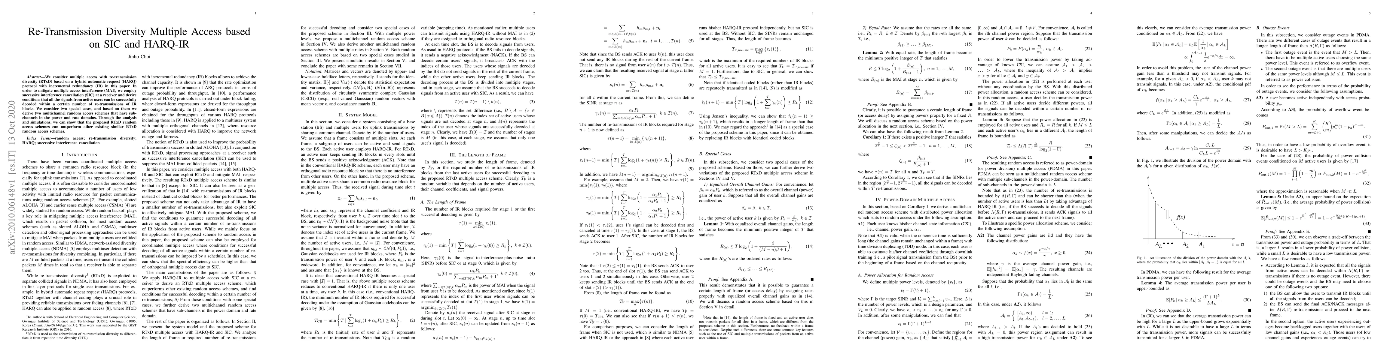 We consider multiple access with re-transmission diversity (RTxD) based on a hybrid automatic request (HARQ) protocol with incremental redundancy (IR) in this paper. In order to mitigate multiple access interference (MAI), we employ successive interference cancellation (SIC) at a receiver and derive conditions that all the signals from active users can be successfully decoded within a certain number of re-transmissions of IR blocks. We consider two special cases, and based on them we derive two multichannel random access schemes that have subchannels in the power and rate domains. Through the analysis and simulations, we can show that the proposed RTxD random access schemes can outperform other existing similar RTxD random access schemes.