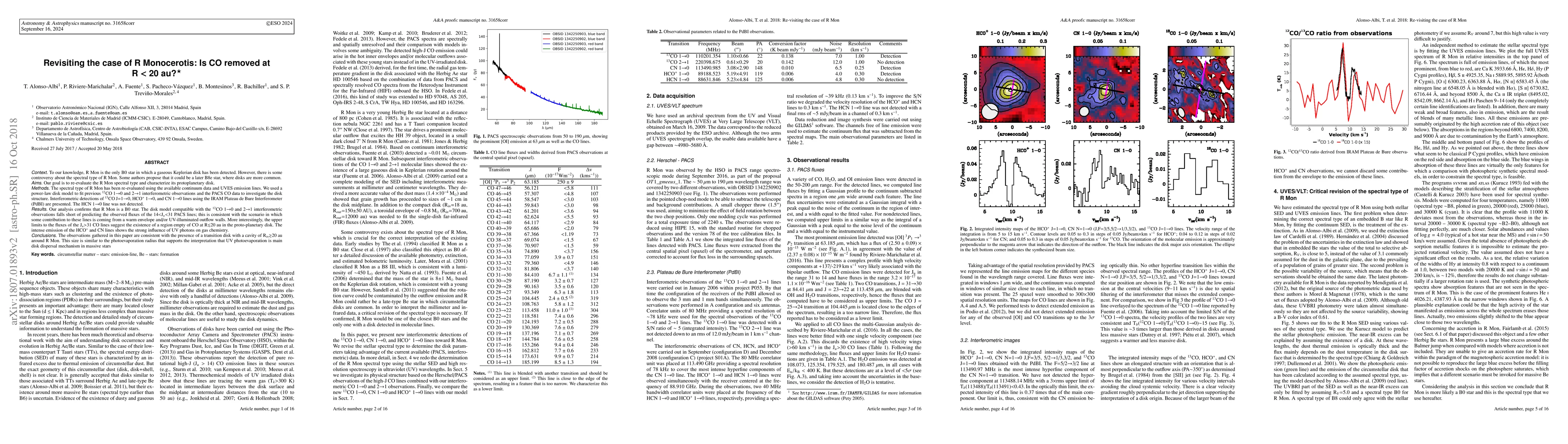 This paper confirms R Mon as a B0 star with a gaseous Keplerian disk, revealing a disk structure that lacks CO at radii less than 20 au, suggesting a transition disk with a cavity possibly due to UV photoevaporation. The study also highlights the influence of UV photons on gas chemistry through strong HCO+ and CN line emissions.