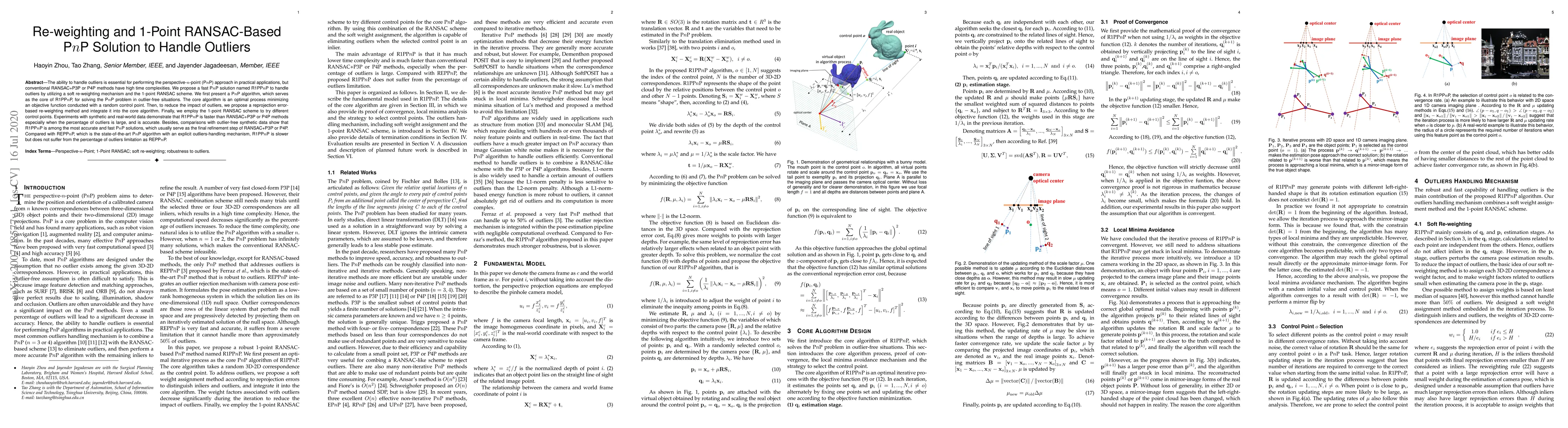 The ability to handle outliers is essential for performing the perspective-n-point (PnP) approach in practical applications, but conventional RANSAC+P3P or P4P methods have high time complexities. We propose a fast PnP solution named R1PPnP to handle outliers by utilizing a soft re-weighting mechanism and the 1-point RANSAC scheme. We first present a PnP algorithm, which serves as the core of R1PPnP, for solving the PnP problem in outlier-free situations. The core algorithm is an optimal process minimizing an objective function conducted with a random control point. Then, to reduce the impact of outliers, we propose a reprojection error-based re-weighting method and integrate it into the core algorithm. Finally, we employ the 1-point RANSAC scheme to try different control points. Experiments with synthetic and real-world data demonstrate that R1PPnP is faster than RANSAC+P3P or P4P methods especially when the percentage of outliers is large, and is accurate. Besides, comparisons with outlier-free synthetic data show that R1PPnP is among the most accurate and fast PnP solutions, which usually serve as the final refinement step of RANSAC+P3P or P4P. Compared with REPPnP, which is the state-of-the-art PnP algorithm with an explicit outliers-handling mechanism, R1PPnP is slower but does not suffer from the percentage of outliers limitation as REPPnP.