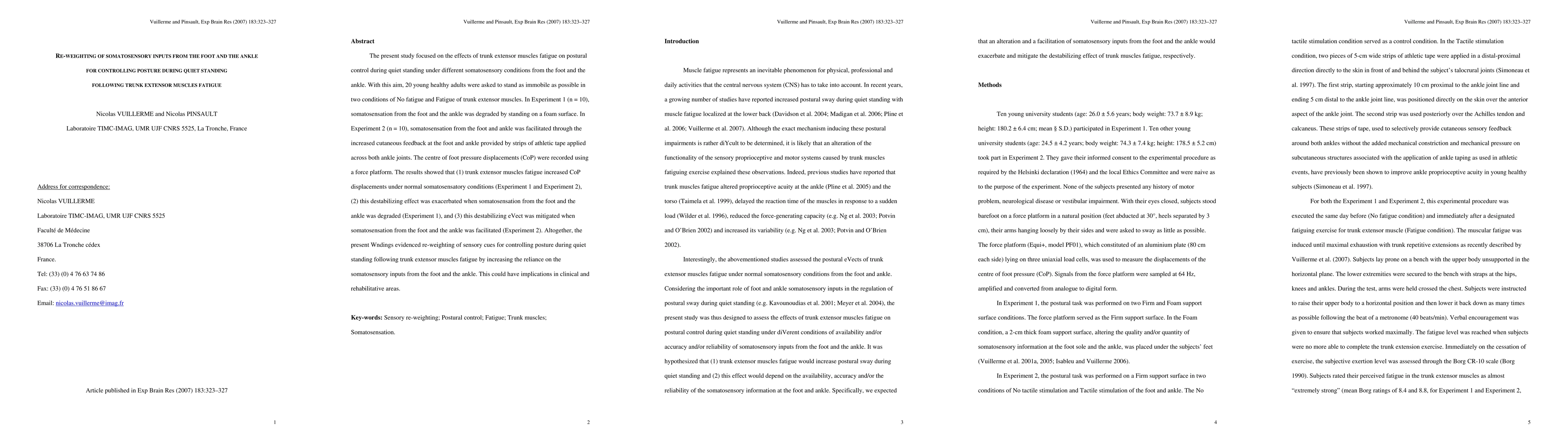 This study investigates how fatigue in trunk extensor muscles affects postural control during quiet standing, finding that fatigue increases postural instability, which is worsened by degraded somatosensory inputs from the foot and ankle but mitigated by enhanced somatosensory feedback. The results suggest a re-weighting of sensory cues to maintain balance post-fatigue.