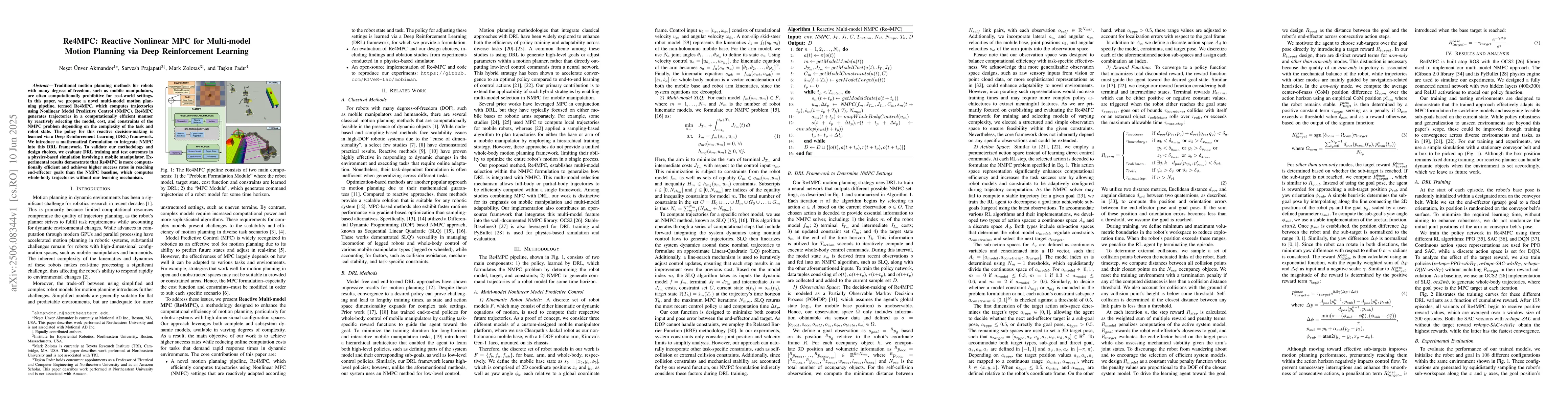 Traditional motion planning methods for robots with many degrees-of-freedom, such as mobile manipulators, are often computationally prohibitive for real-world settings. In this paper, we propose a novel multi-model motion planning pipeline, termed Re4MPC, which computes trajectories using Nonlinear Model Predictive Control (NMPC). Re4MPC generates trajectories in a computationally efficient manner by reactively selecting the model, cost, and constraints of the NMPC problem depending on the complexity of the task and robot state. The policy for this reactive decision-making is learned via a Deep Reinforcement Learning (DRL) framework. We introduce a mathematical formulation to integrate NMPC into this DRL framework. To validate our methodology and design choices, we evaluate DRL training and test outcomes in a physics-based simulation involving a mobile manipulator. Experimental results demonstrate that Re4MPC is more computationally efficient and achieves higher success rates in reaching end-effector goals than the NMPC baseline, which computes whole-body trajectories without our learning mechanism.