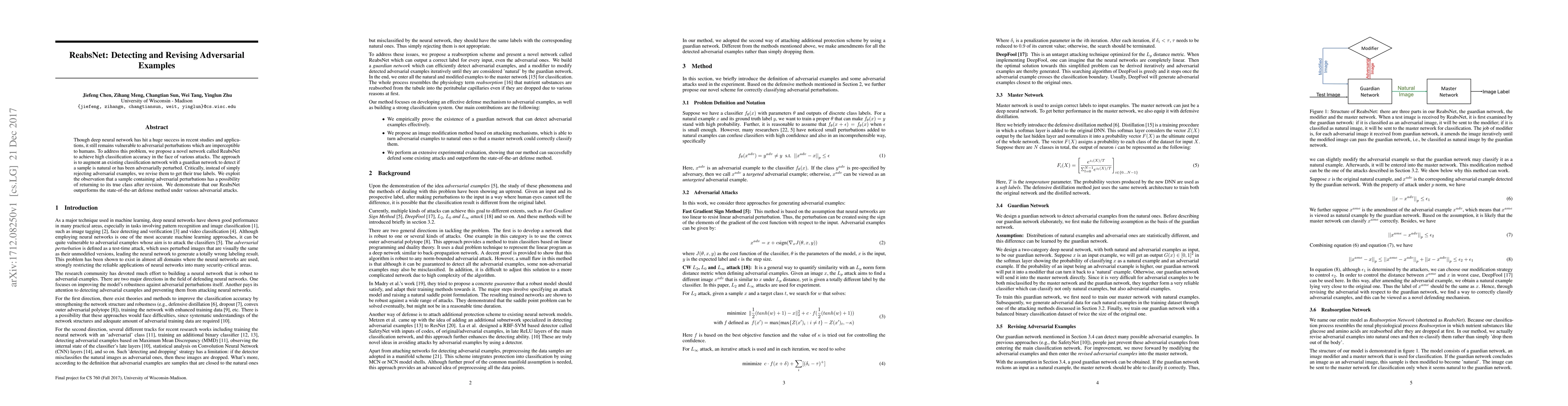 Though deep neural network has hit a huge success in recent studies and applica- tions, it still remains vulnerable to adversarial perturbations which are imperceptible to humans. To address this problem, we propose a novel network called ReabsNet to achieve high classification accuracy in the face of various attacks. The approach is to augment an existing classification network with a guardian network to detect if a sample is natural or has been adversarially perturbed. Critically, instead of simply rejecting adversarial examples, we revise them to get their true labels. We exploit the observation that a sample containing adversarial perturbations has a possibility of returning to its true class after revision. We demonstrate that our ReabsNet outperforms the state-of-the-art defense method under various adversarial attacks.