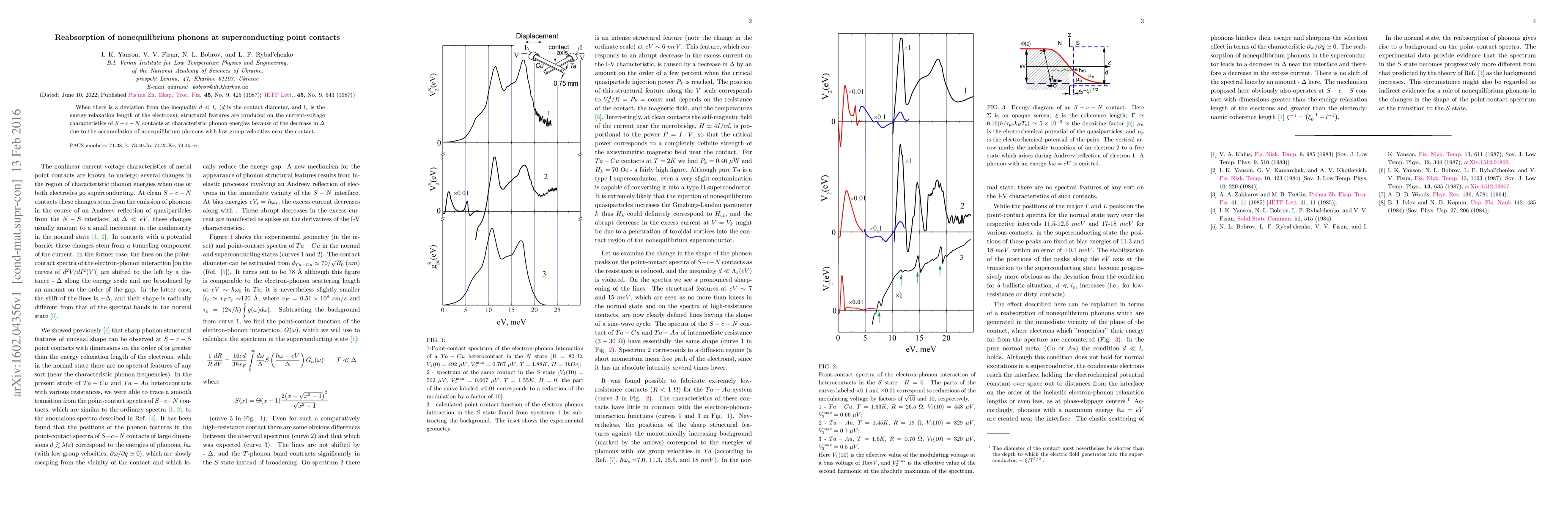 When there is a deviation from the inequality $d\ll {{l}_{\varepsilon }}$ ($d$ is the contact diameter, and ${{l}_{\varepsilon }}$ is the energy relaxation length of the electrons), structural features are produced on the current-voltage characteristics of $S-c-N$ contacts at characteristic phonon energies because of the decrease in $\Delta $ due to the accumulation of nonequilibrium phonons with low group velocities near the contact.