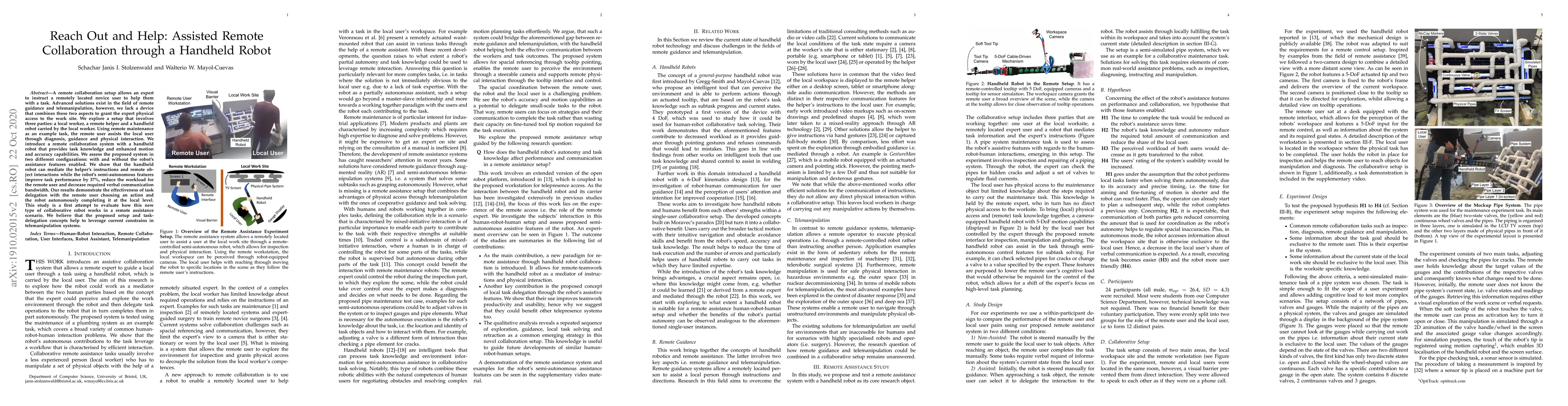 A remote collaboration setup allows an expert to instruct a remotely located novice user to help them with a task. Advanced solutions exist in the field of remote guidance and telemanipulation, however, we lack a device that combines these two aspects to grant the expert physical access to the work site. We explore a setup that involves three parties: a local worker, a remote helper and a handheld robot carried by the local worker. Using remote maintenance as an example task, the remote user assists the local user through diagnosis, guidance and physical interaction. We introduce a remote collaboration system with a handheld robot that provides task knowledge and enhanced motion and accuracy capabilities. We assess the proposed system in two different configurations: with and without the robot's assistance features enabled. We show that the handheld robot can mediate the helper's instructions and remote object interactions while the robot's semi-autonomous features improve task performance by 37%, reduce the workload for the remote user and decrease required verbal communication bandwidth. Our results demonstrate the effectiveness of task delegation with the remote user choosing an action and the robot autonomously completing it at the local level. This study is a first attempt to evaluate how this new type of collaborative robot works in a remote assistance scenario. We believe that the proposed setup and task-delegation concepts help to leverage current constrains in telemanipulation systems.
