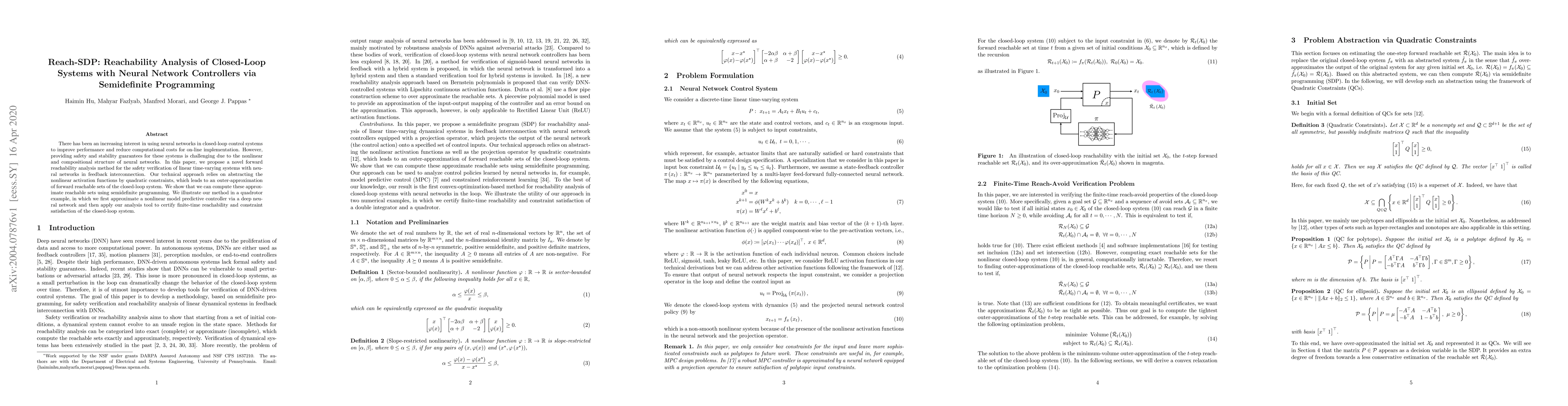 This paper proposes a novel reachability analysis method for closed-loop systems using neural networks, relying on semidefinite programming to approximate reachable sets via quadratic constraints. The method is demonstrated through a quadrotor example to certify finite-time reachability and constraint satisfaction.