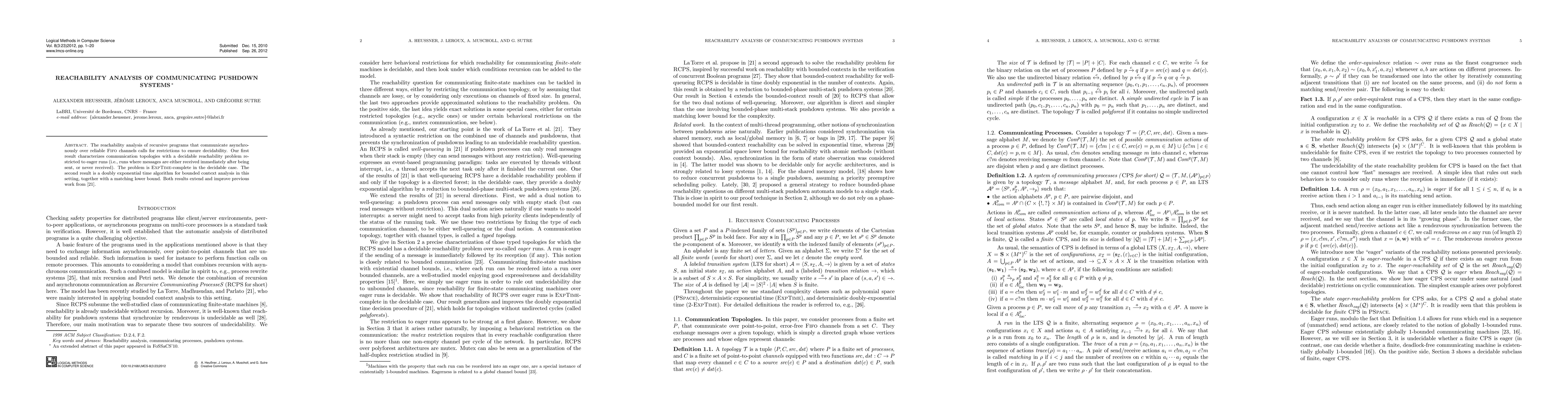 This paper analyzes reachability in communicating pushdown systems with FIFO channels, establishing decidability conditions and a doubly exponential time algorithm for bounded context analysis.
