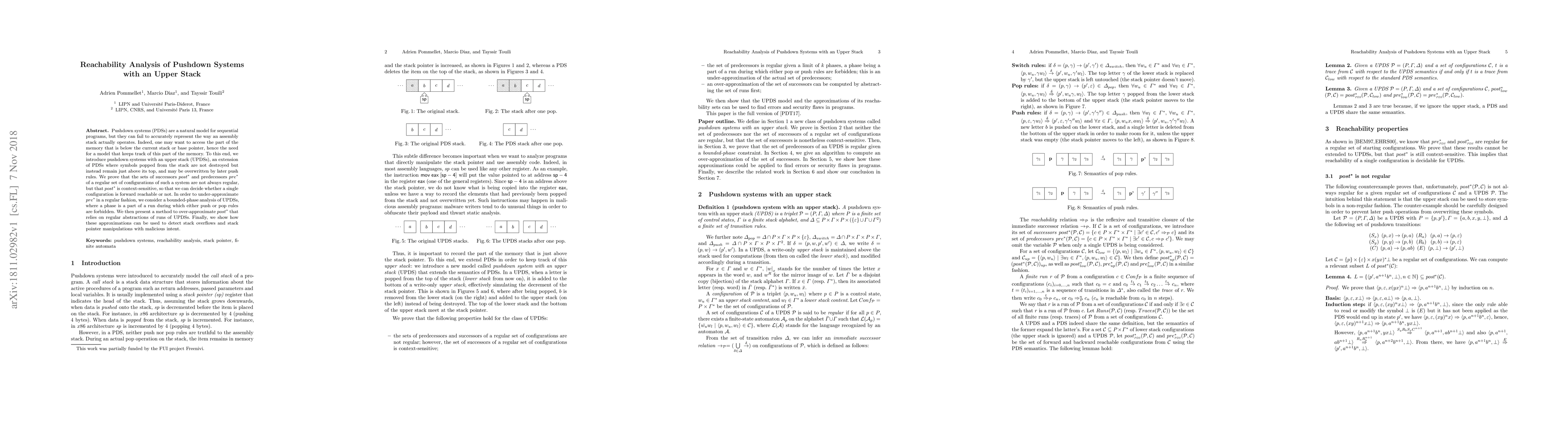 This paper introduces pushdown systems with an upper stack (UPDSs) to model assembly stacks more accurately, showing that reachability analysis of UPDSs can detect stack overflows and malicious intent.