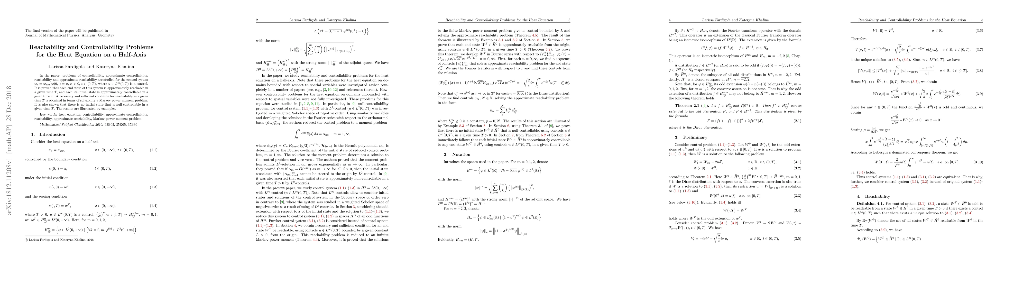 This paper investigates controllability and reachability for the heat equation on a half-axis, proving approximate reachability and controllability within a time frame $T$. It establishes a necessary and sufficient condition for exact reachability linked to a Markov power moment problem and shows no null-controllability.